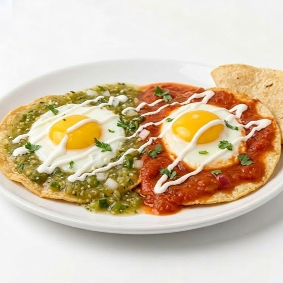 2 Huevos estrellados montados en tortilla frita bañados en salsa a elegir, rallado de crema y pico de gallo, acompañados con una cama de frijoles.