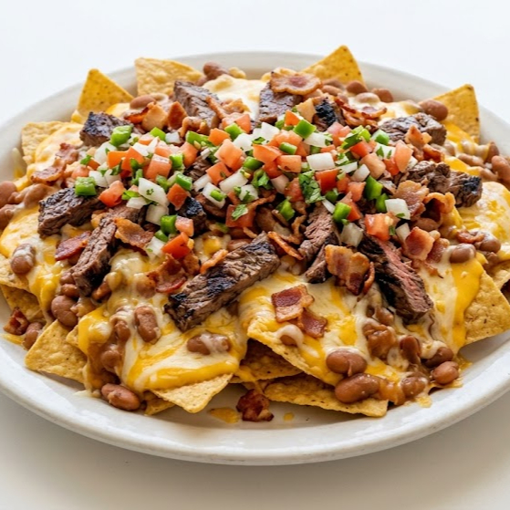 Totopos, queso chihuahua, frijoles rancheros, queso amarillo, tocino frito, pico de gallo. Elige entre arrachera o pollo a la plancha.