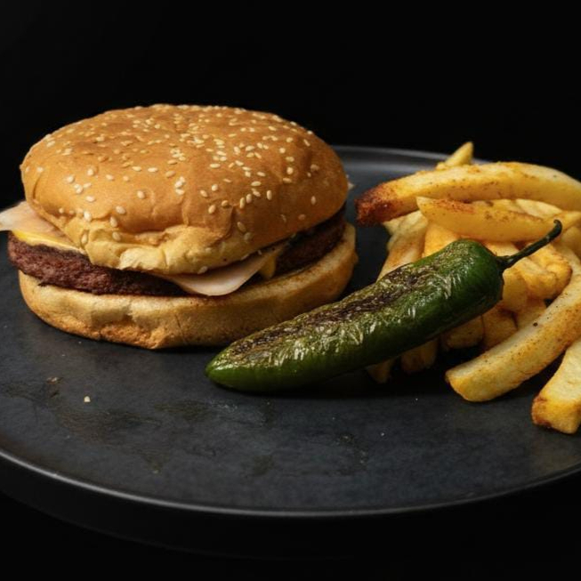 Carne 100% de Res, Jamón, Tocino, Queso Amarillo, Tomate, Cebolla, Chile Toreado. Incluye papas a la francesa