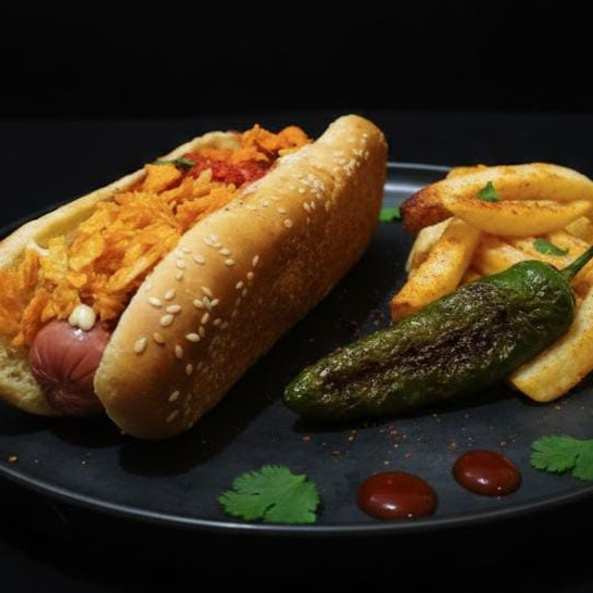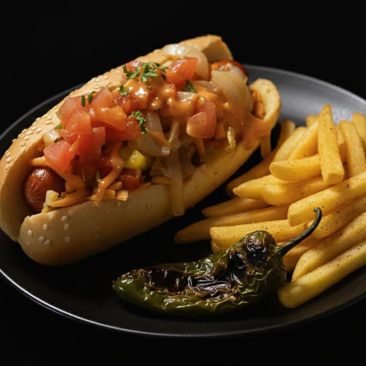 Salchicha de Pavo, mayonesa, catsup, mostaza, topping al gusto, cebolla asada y chile toreado. Incluye papas a la francesa