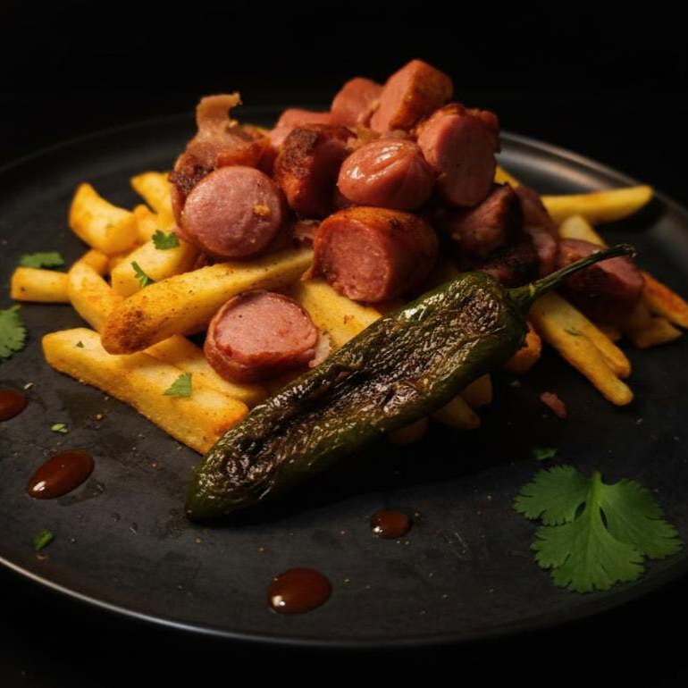 Papas a la francesa, Salchicha de pavo con tocino, carne de trompo, mayonesa, catsup y chile toreado