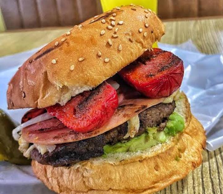 150 g Carne de res casera, verdura, queso amarillo, aderezos y jamón.