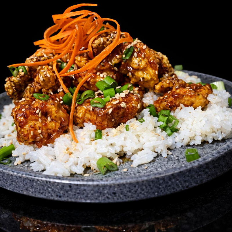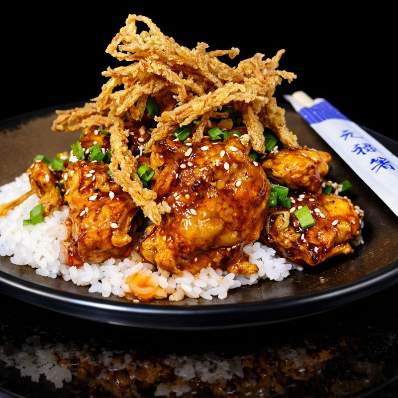 pollo frito en tempura bañado en salsa teriyaki acompañado de arroz y ajonjolí
