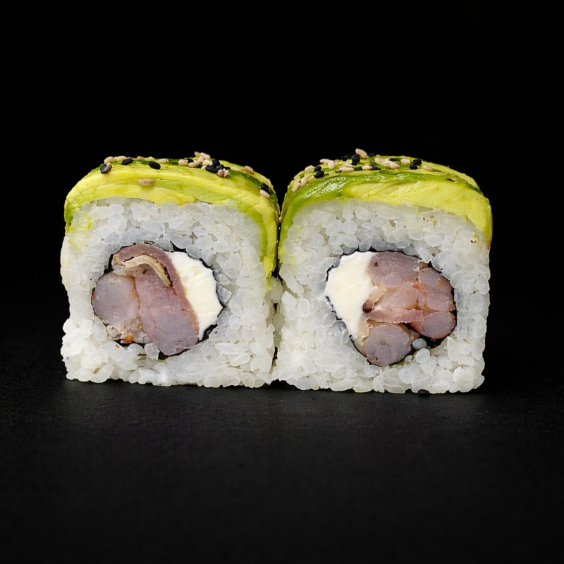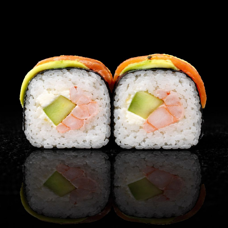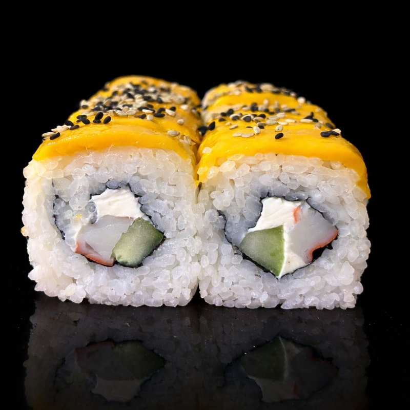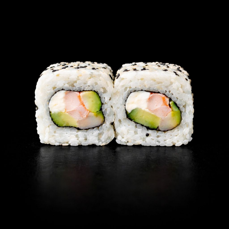 Por dentro aguacate, queso crema, pepino y camarón cocido. Por fuera ajonjolí, acompañado de salsa dulce y soya cítricos.