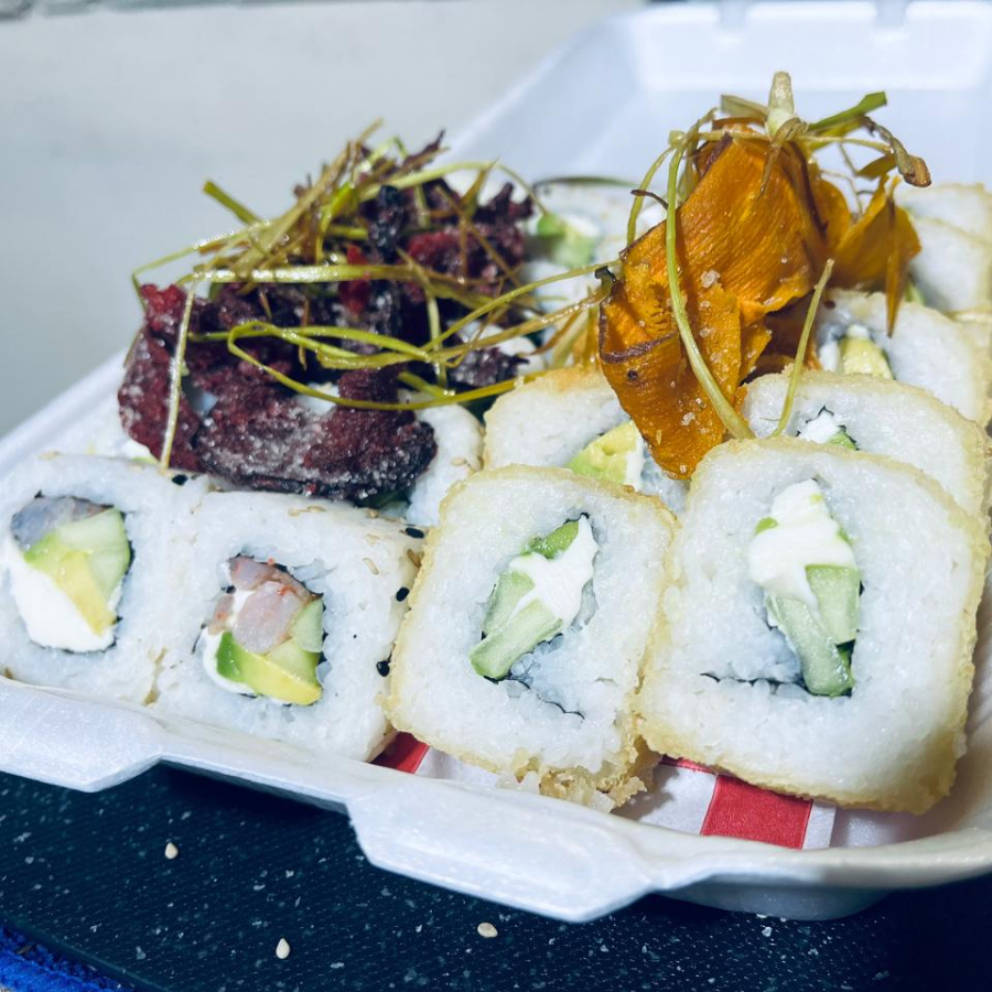 Por dentro aguacate, queso crema y pepino. Por fuera ensalada tampico, ajonjolí y acompañado de soya cítricos.