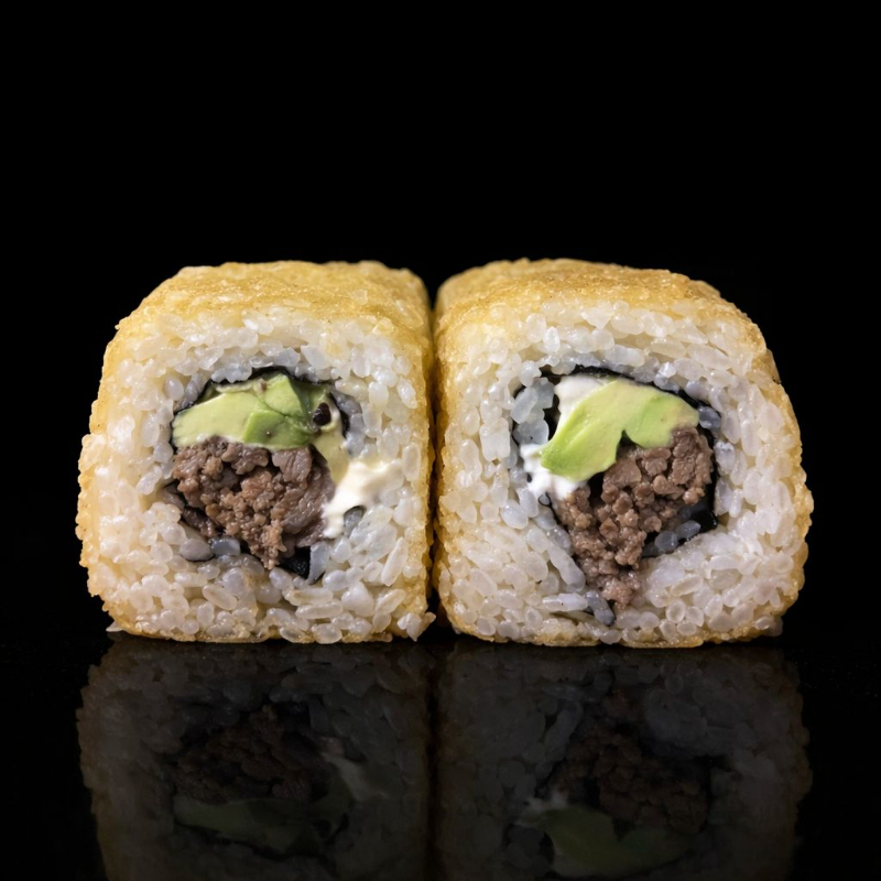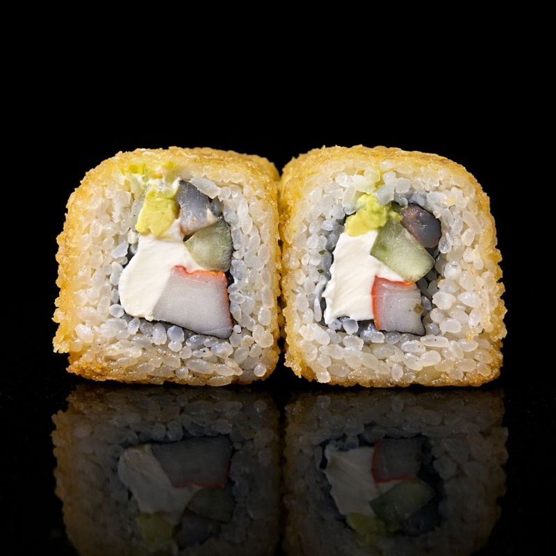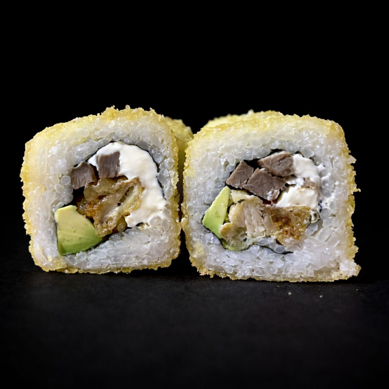 Por dentro aguacate, queso crema, pepino, camarón y surimi. Por fuera empanizado y acompañado de chipotle y soya cítricos.