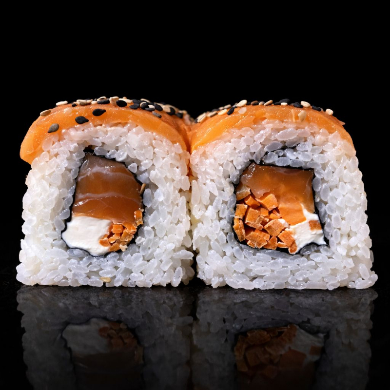 Por dentro salmón, queso crema, aguacate pepino y ajonjolí.
