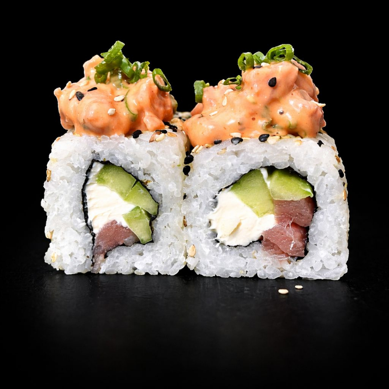 rollo fresco por dentro queso crema pepino aguacate atun por fuera atun picante