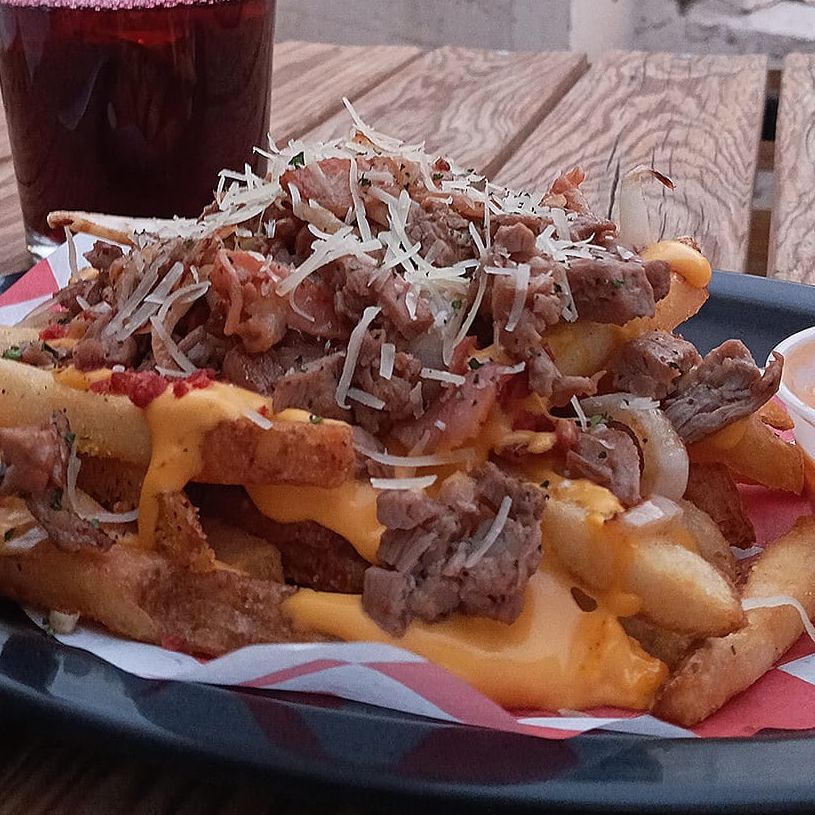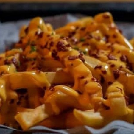 Bañadas en queso cheddar y mix de arrachera, cebolla, tocino y queso.