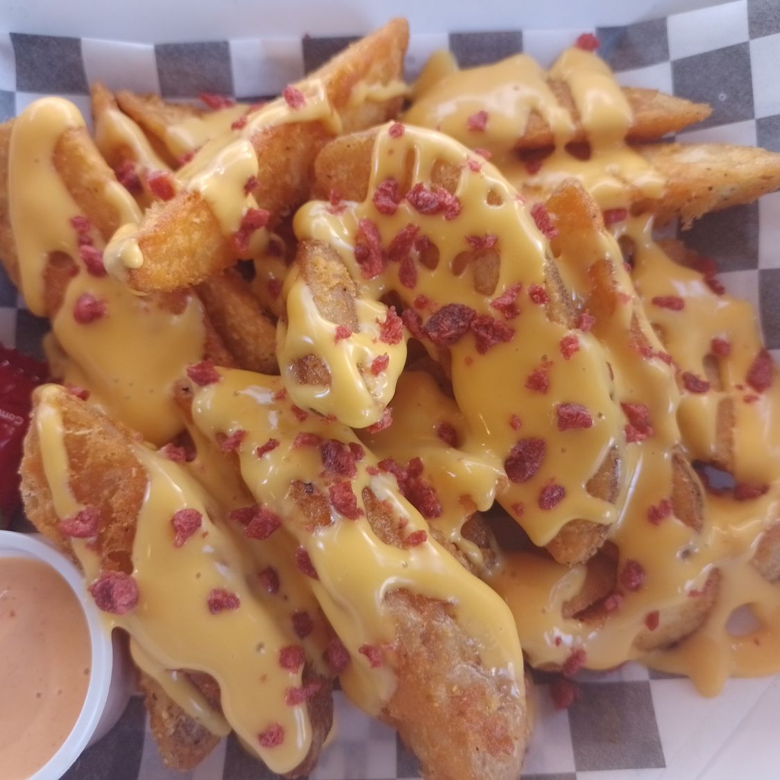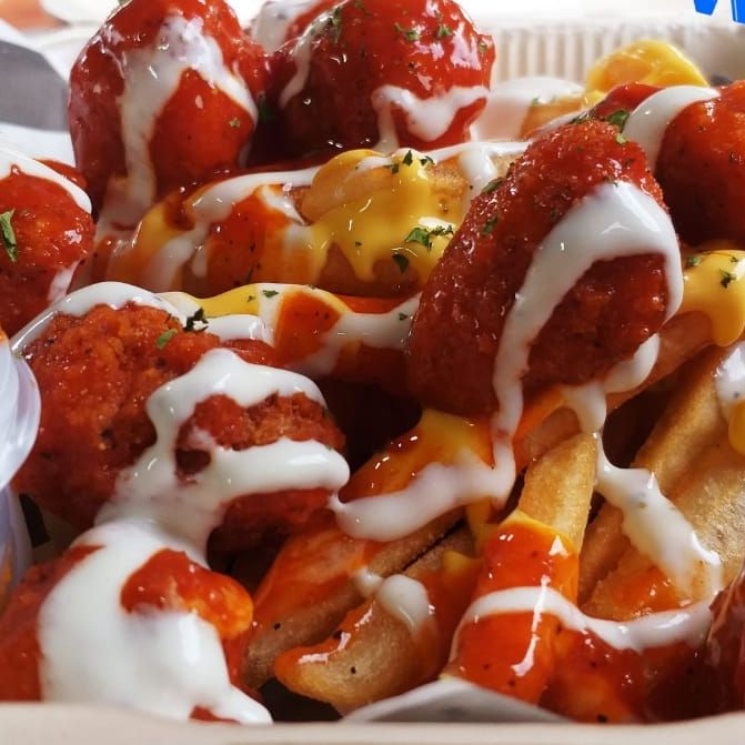 Papas ala francesa bañadas en queso cheddar con mini bonneles bufalo y aderezo ranch