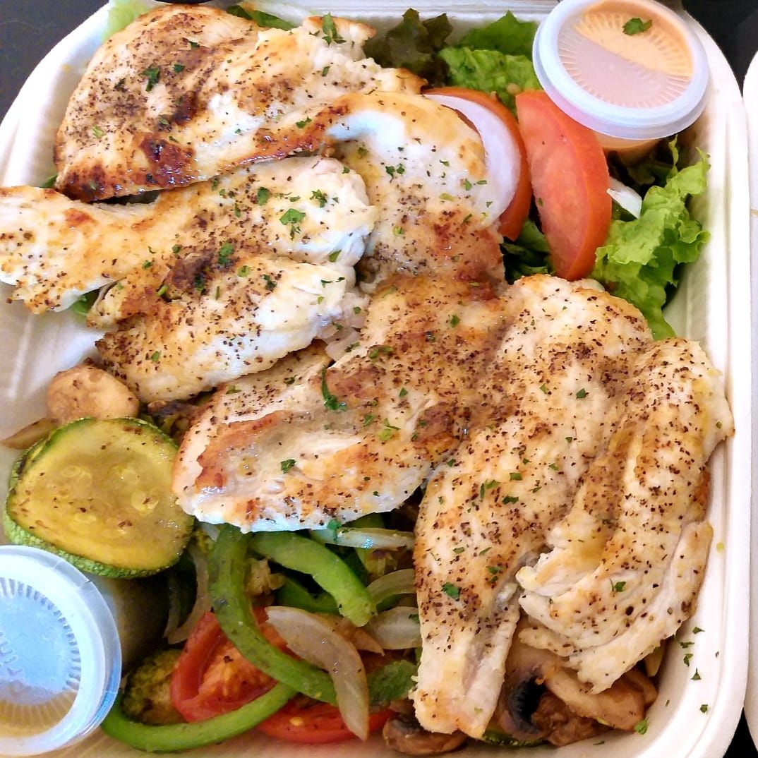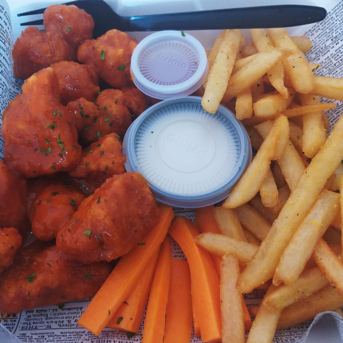 100% de pechuga de pollo, con papas a la francesa y aderezo.