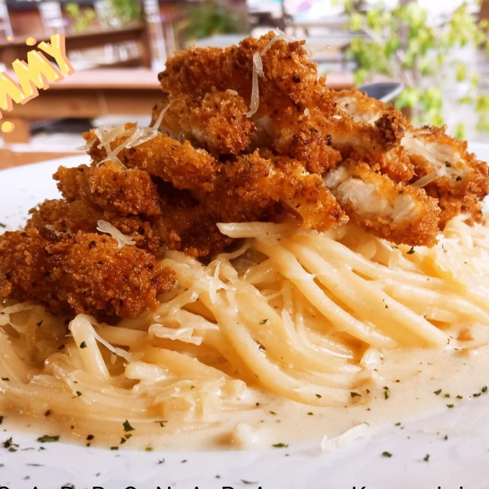 Pasta cremosa, queso parmesano y con trocitos de tocino.