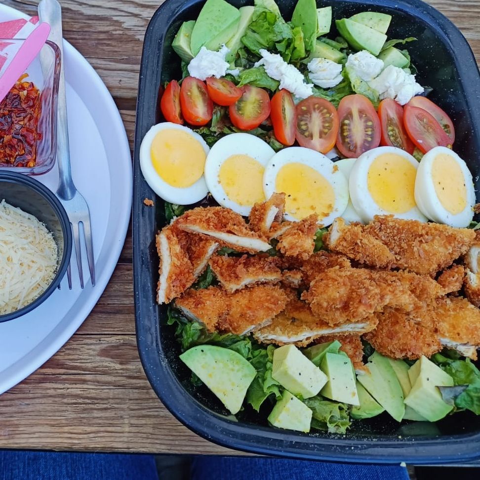 Huevo cocido, tocino, pechuga EMPANIZADA, tomate, queso de cabra y aguacate, sobre una cama de mix de lechugas y aderezo.