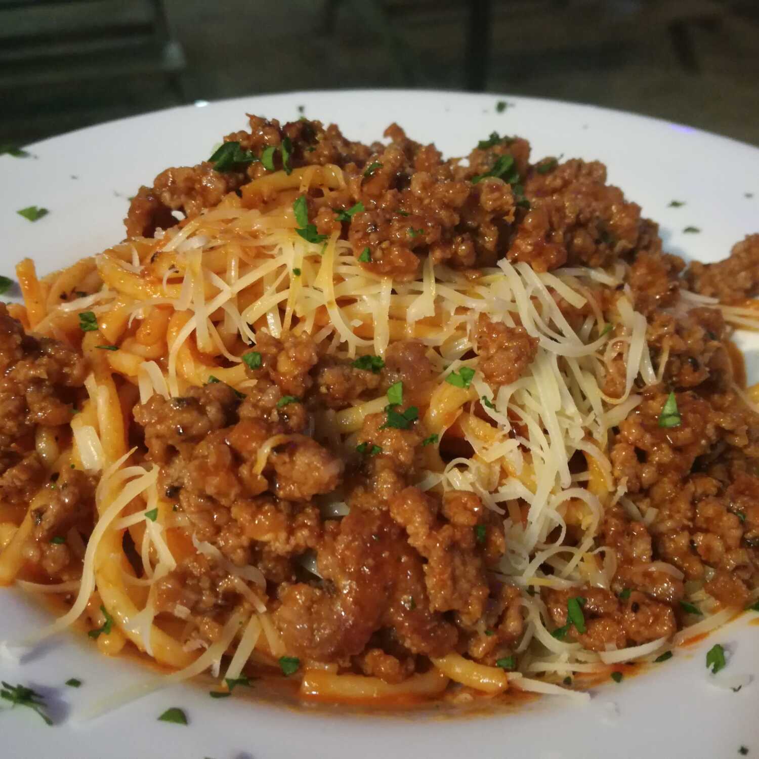 Pasta en salsa tradicional con carne de res y queso parmesano.