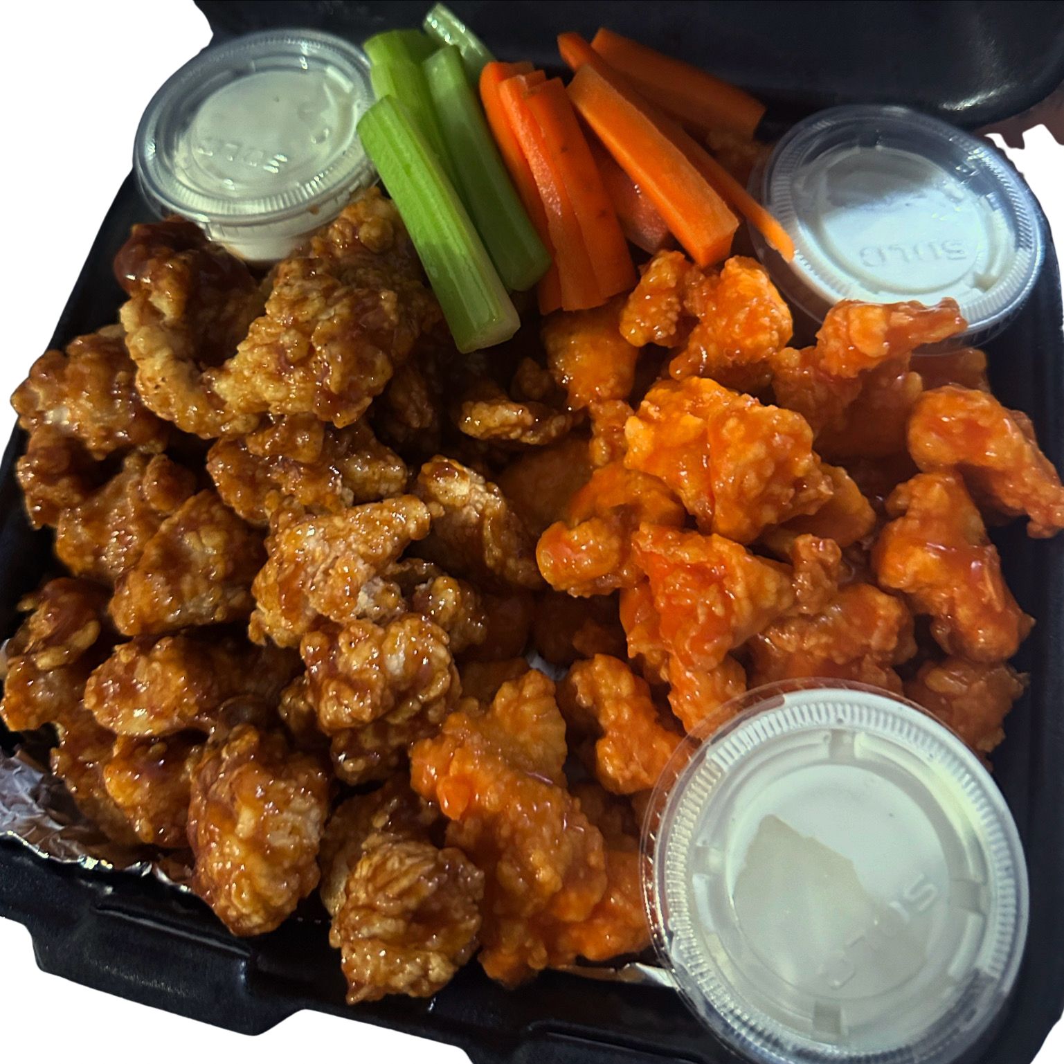 Kilo de boneless, bañados de tu salsa favorita acompañados de verduras y aderezo ranch . Salsas: mango habanero, habanero hot, parmahot, búfalo,lemon peper y BBQ (2 salsas a elegir)