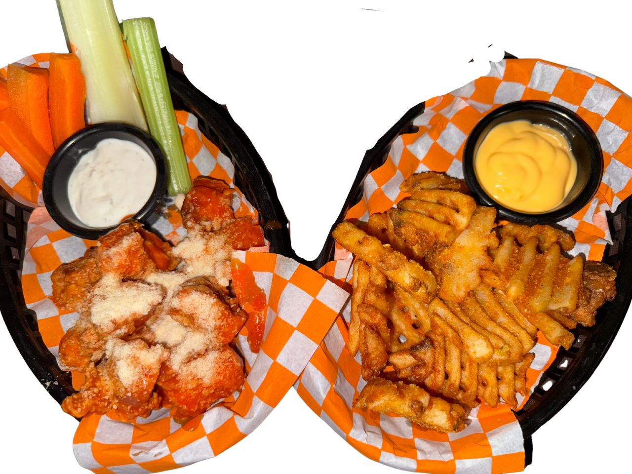 Dos órdenes de boneless, bañados en tu salsa favorita, orden de papas a la francesa acompañados de verduras y aderezo ranch. Salsas: mango habanero, habanero hot, parmahot, búfalo,lemon peper y BBQ (2 salsas a elegir)