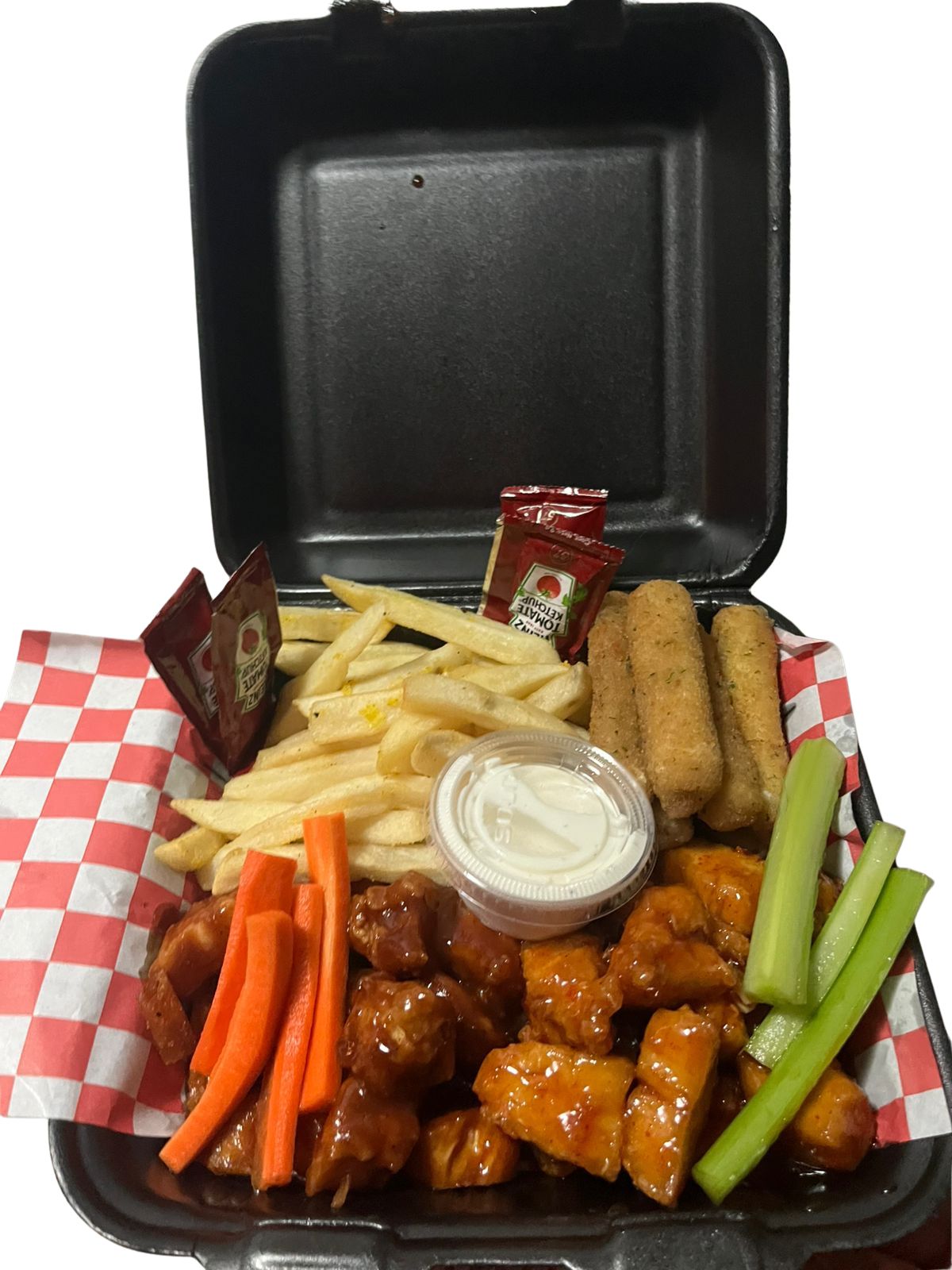 Medio kilo de boneless, bañados en tu salsa favorita orden de papas a la francesa, orden de dedos dMedio kilo de boneless, bañados en tu salsa favorita orden de papas a la francesa, orden de dedos de queso, acompañados de verduras y aderezo ranch. Salsas: mango habanero, habanero hot, parmahot, búfalo,lemon peper y BBQ(2 salsas a elegir) .