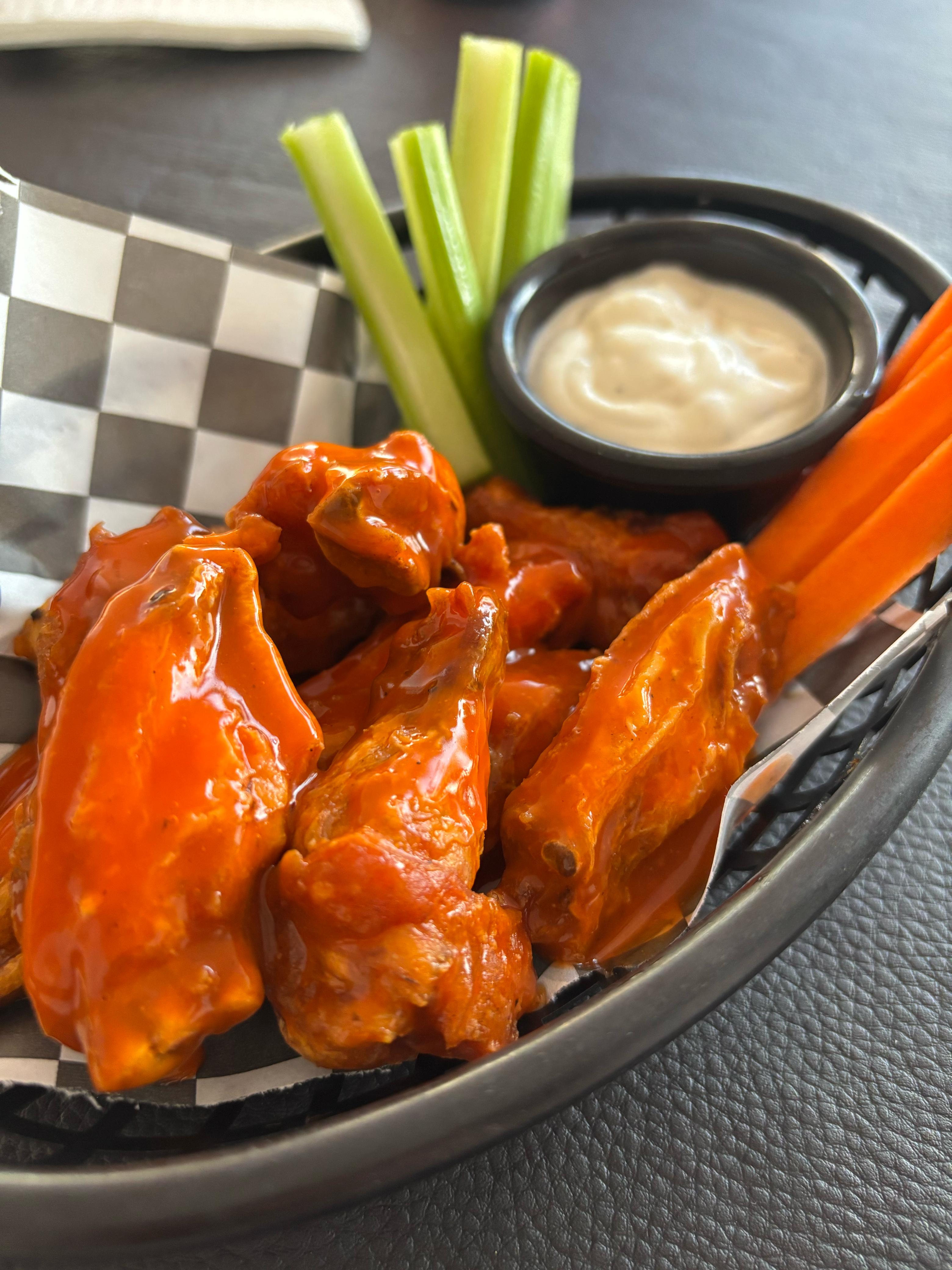 orden de alitas (10 piezas) bañadas en tu salsa favorita a elegir acompañadas de verduras y aderezo ranch