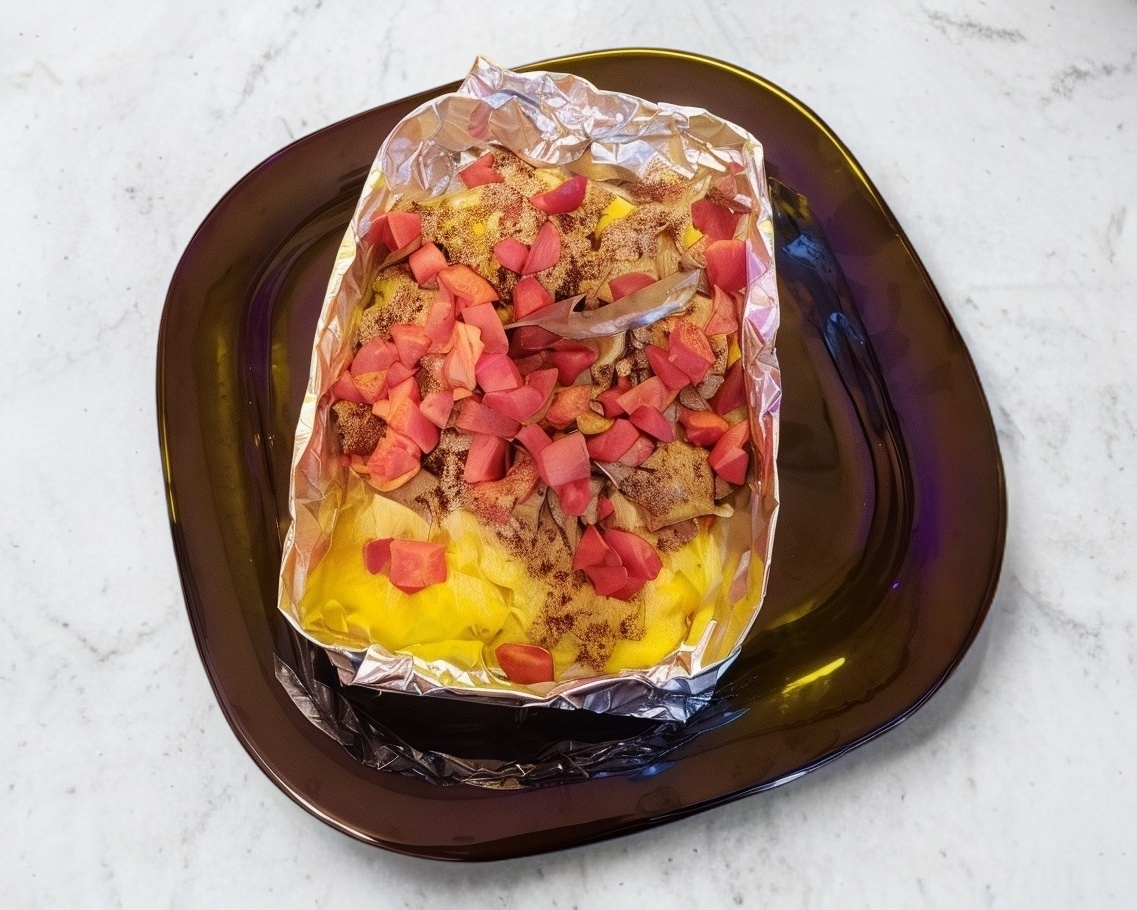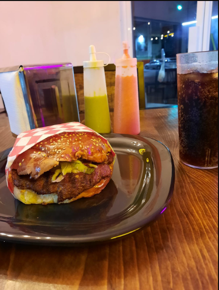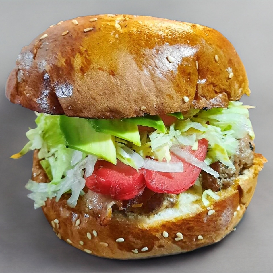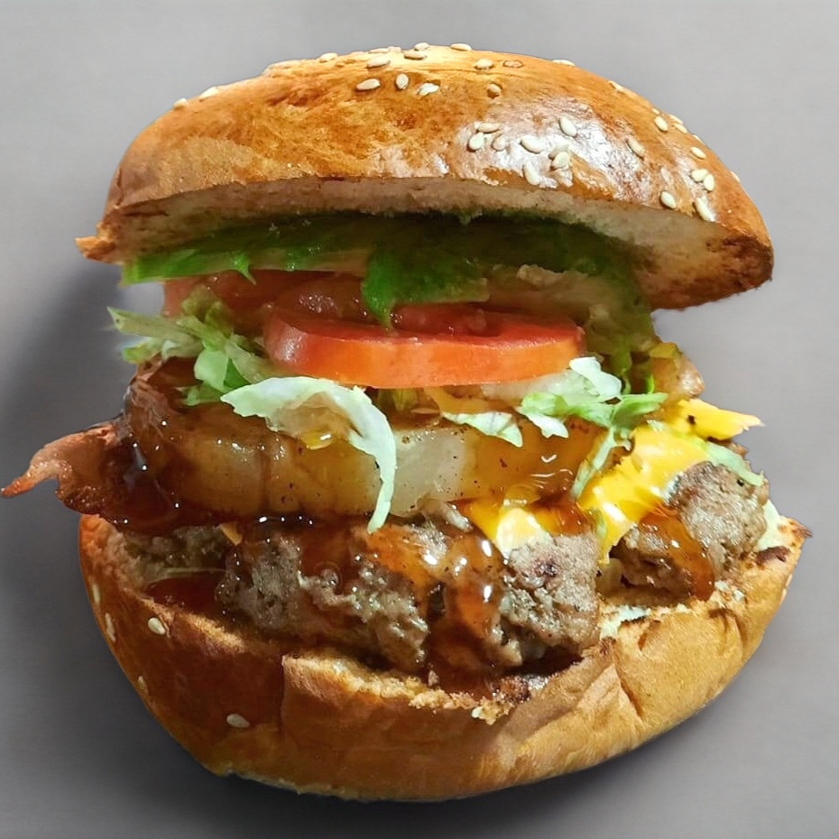 Carne, queso, tocino, piña, teriyaki, aguacate, verdura y aderezos.