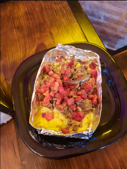 Carne, queso blanco, tocino, salchicha asada, aguacate, verdura y aderezos.