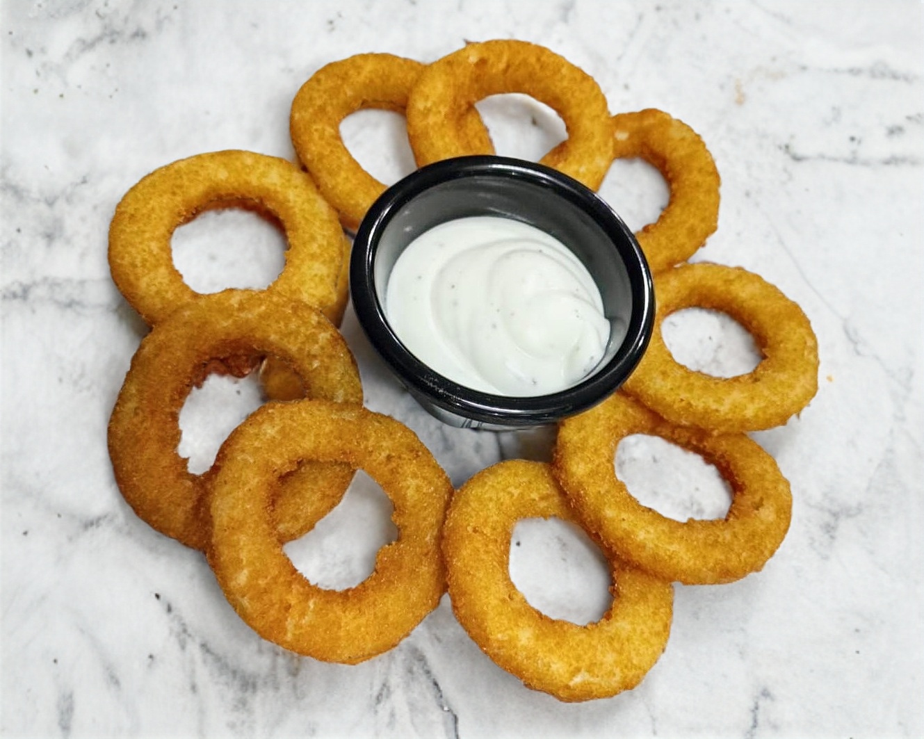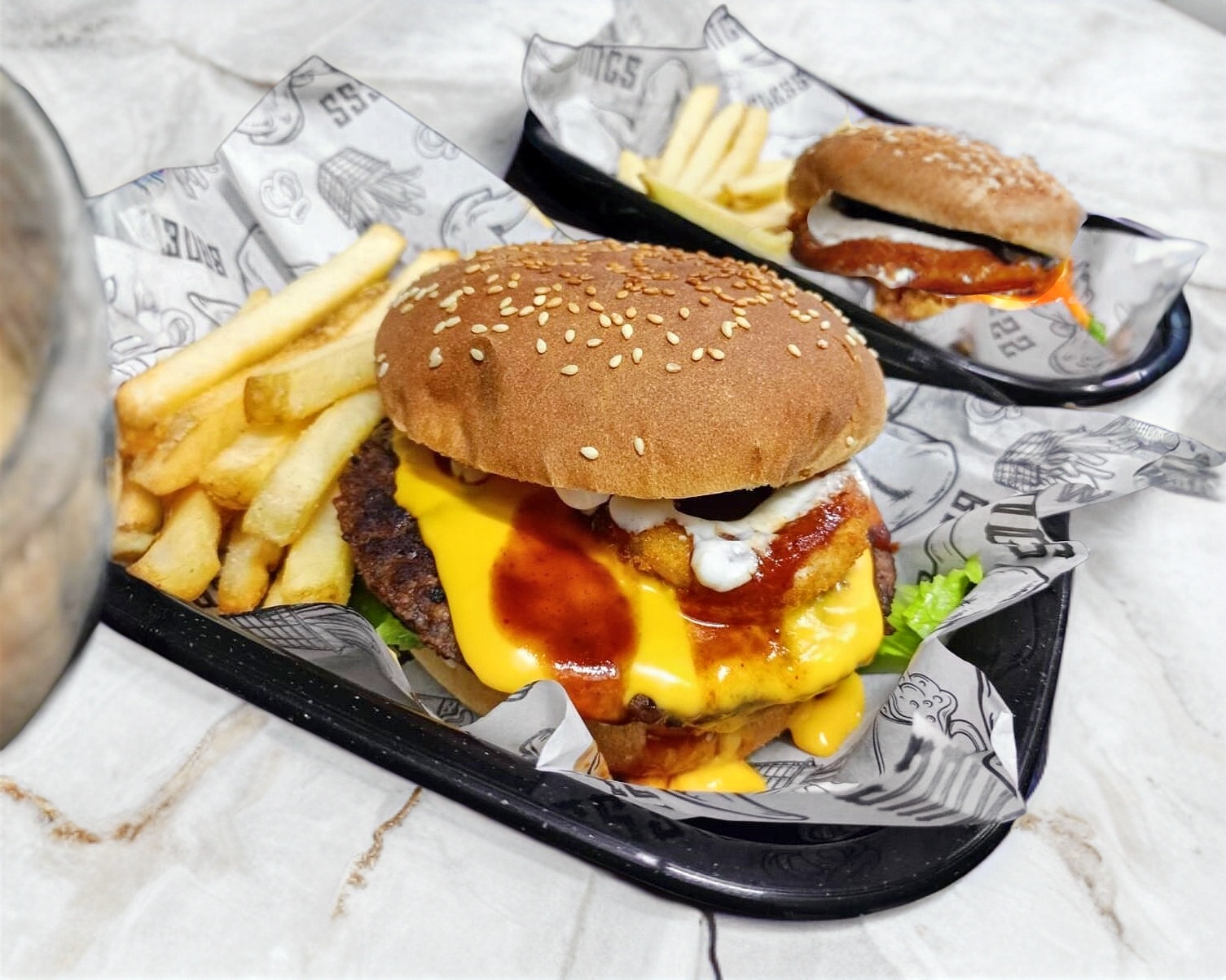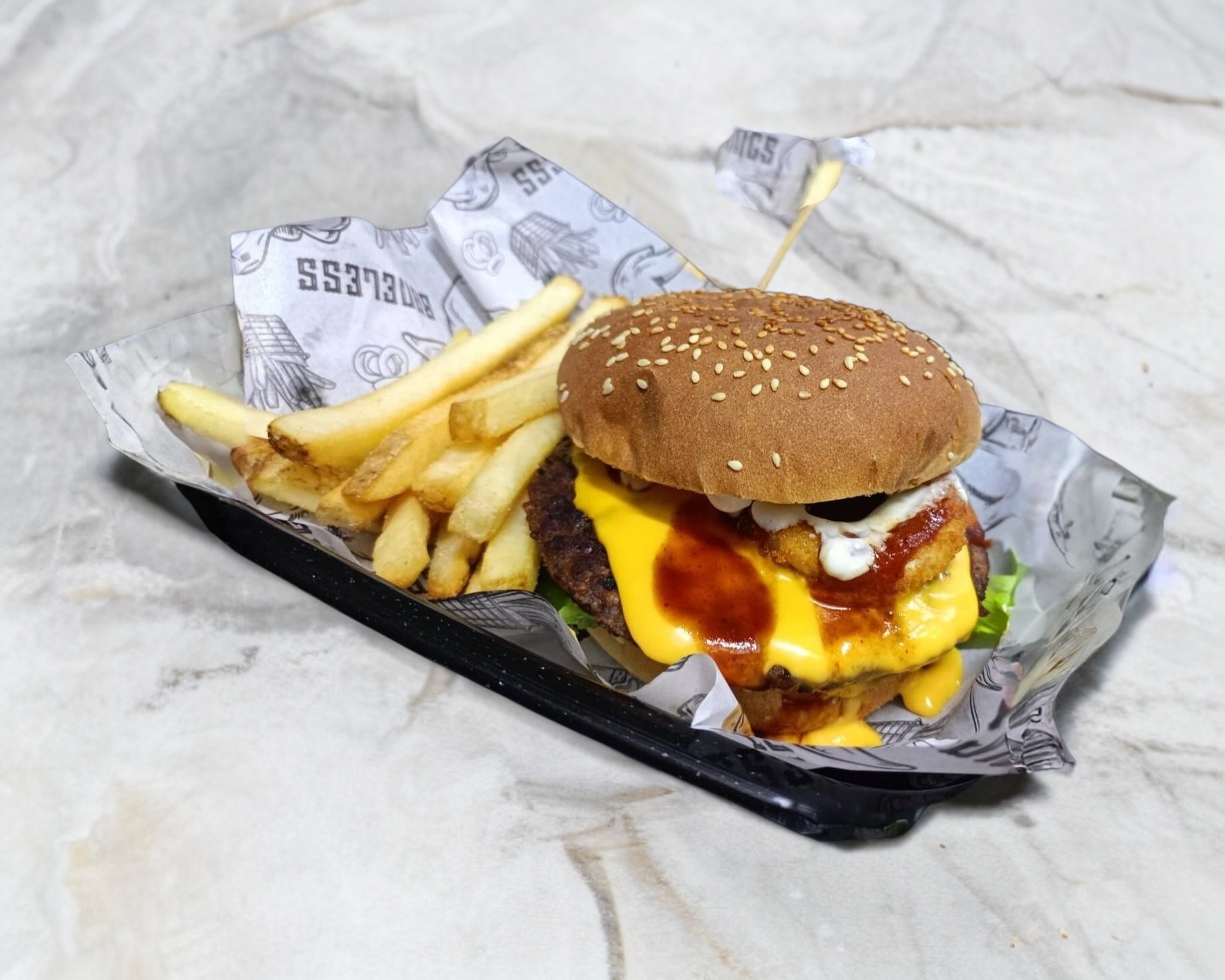 Con lechuga, tomate, aros de cebolla, queso amarillo bañado en salsa y aderezo a elección, acompañado de papas a la francesa.