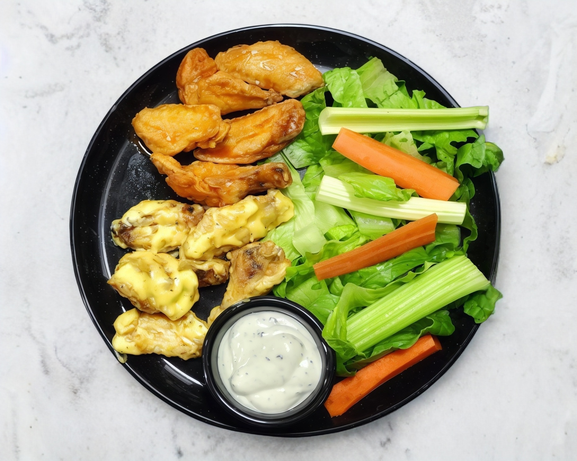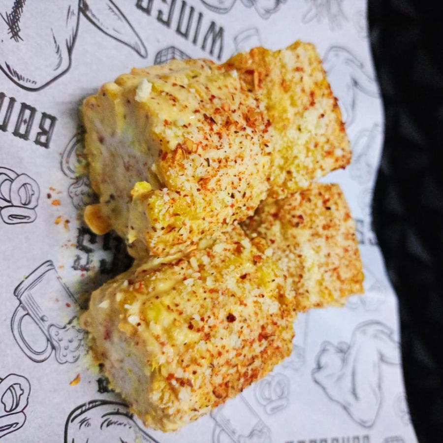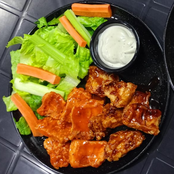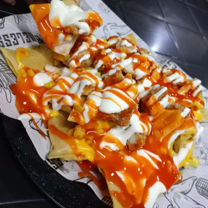 Crujientes totopos bañados en queso amarillo, ranch, salsa buffalo, elote desgranado y trozos de boneles. Para 2 personas.