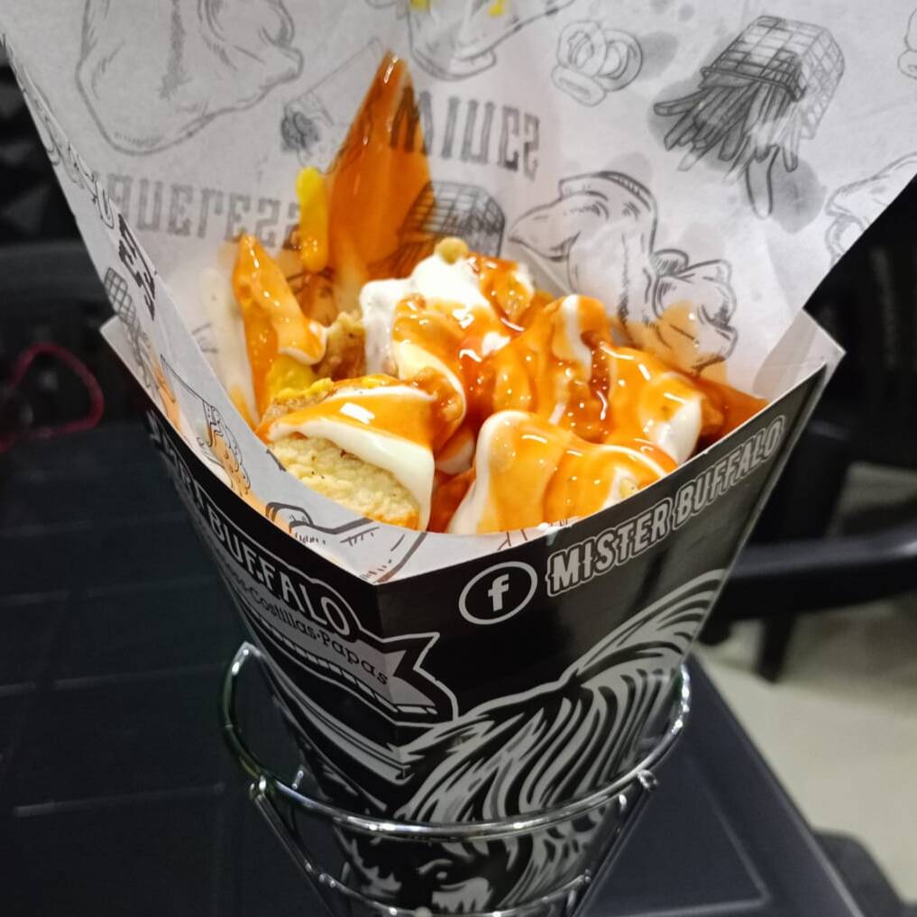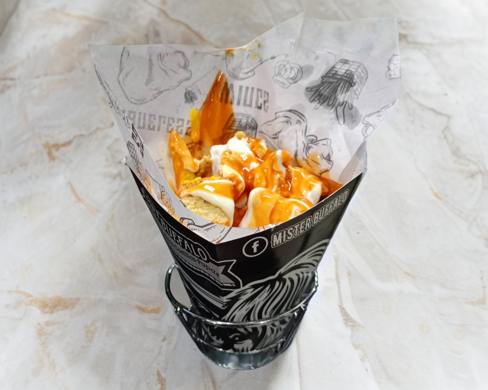 Cono de papas a preparar con una proteína, aderezo y salsa a elegir.