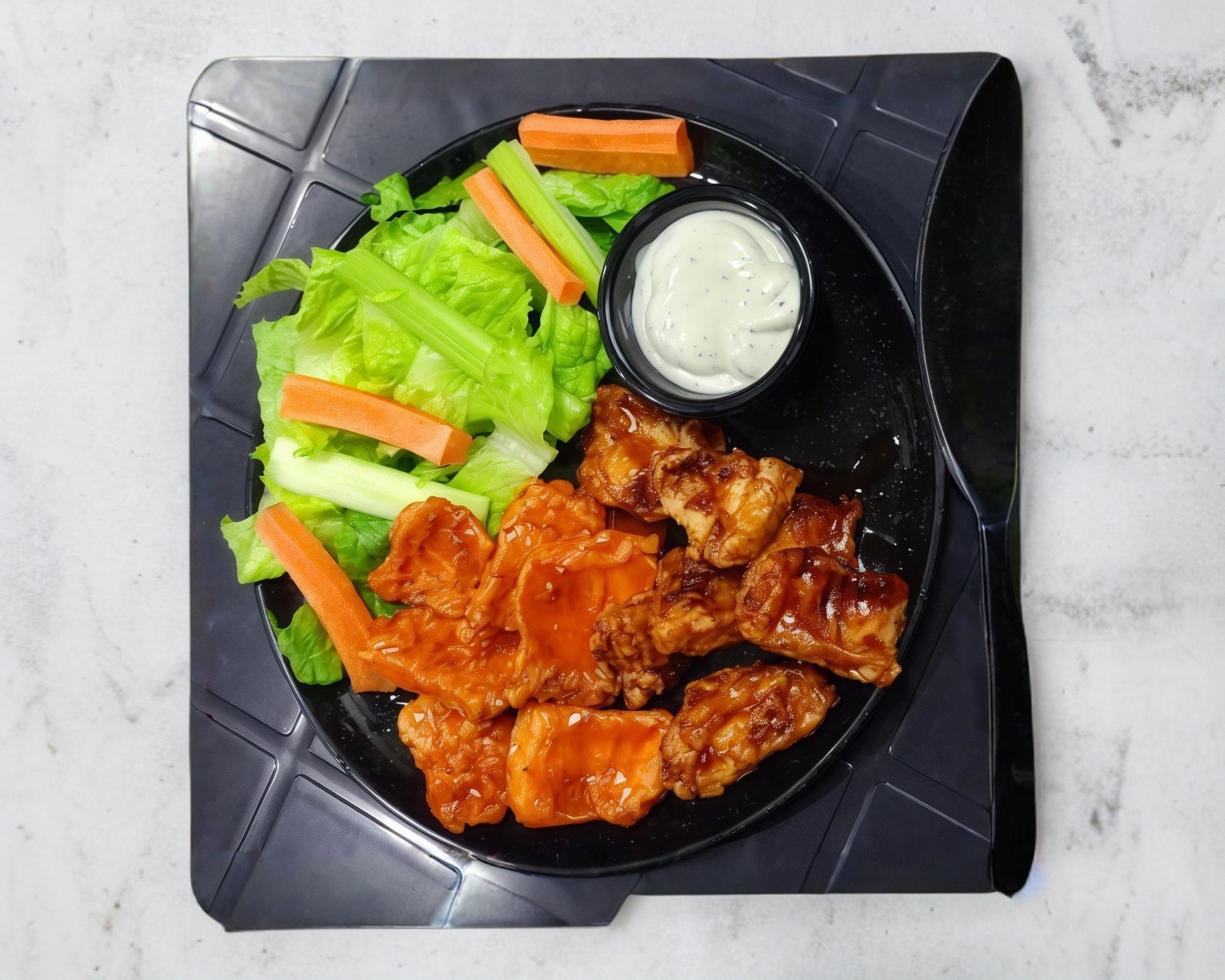 Crujientes totopos bañados en queso amarillo, ranch, salsa buffalo, elote desgranado y trozos de boneles, para una persona.