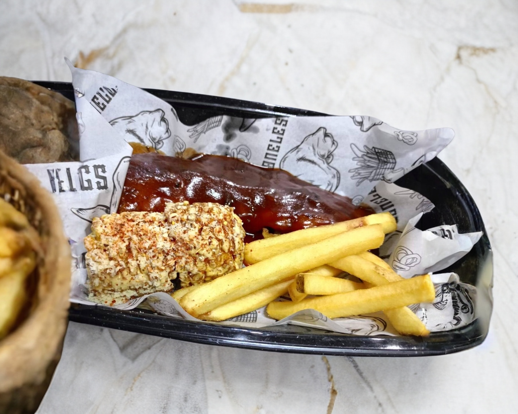 250 Gramos de costilla BBQ, acompañadas con papas y elote.