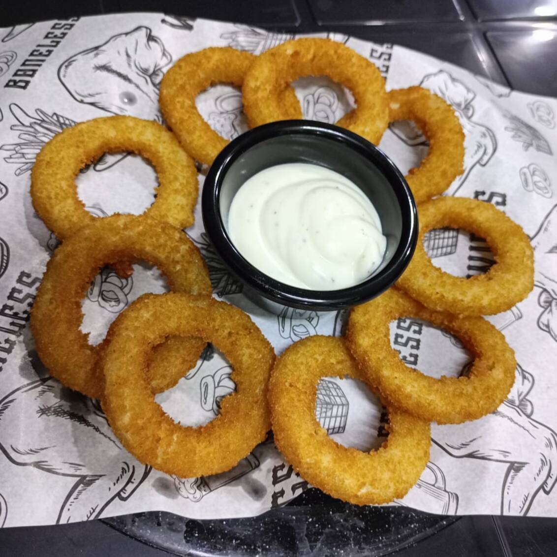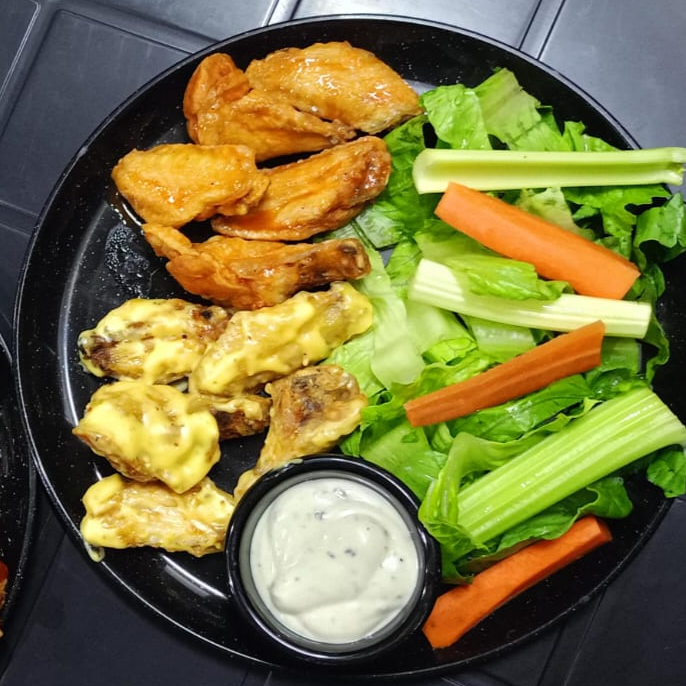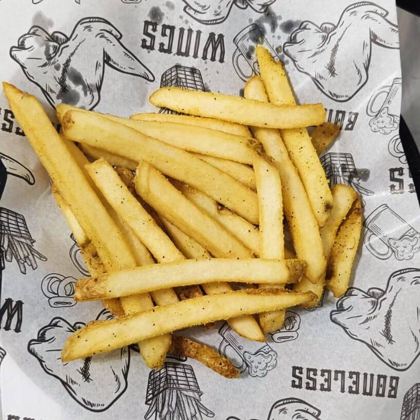 Alitas, boneless, papas a la francesa, papas gajo, criscutt, aros de cebolla, elotes, apio, zanahoria, servido en una caja de pizza.