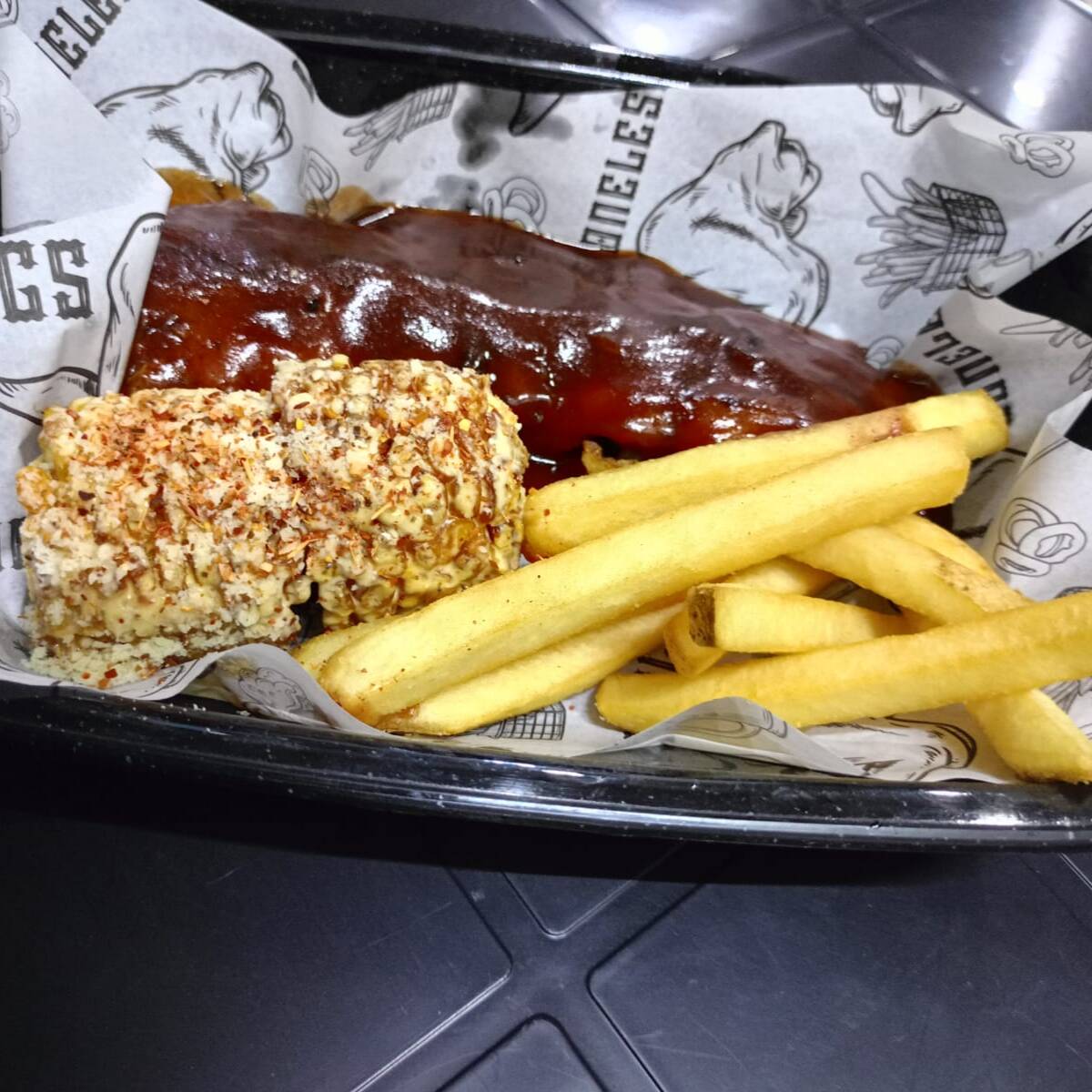 500 Gramos de costilla BBQ, acompañadas con papas y elote.