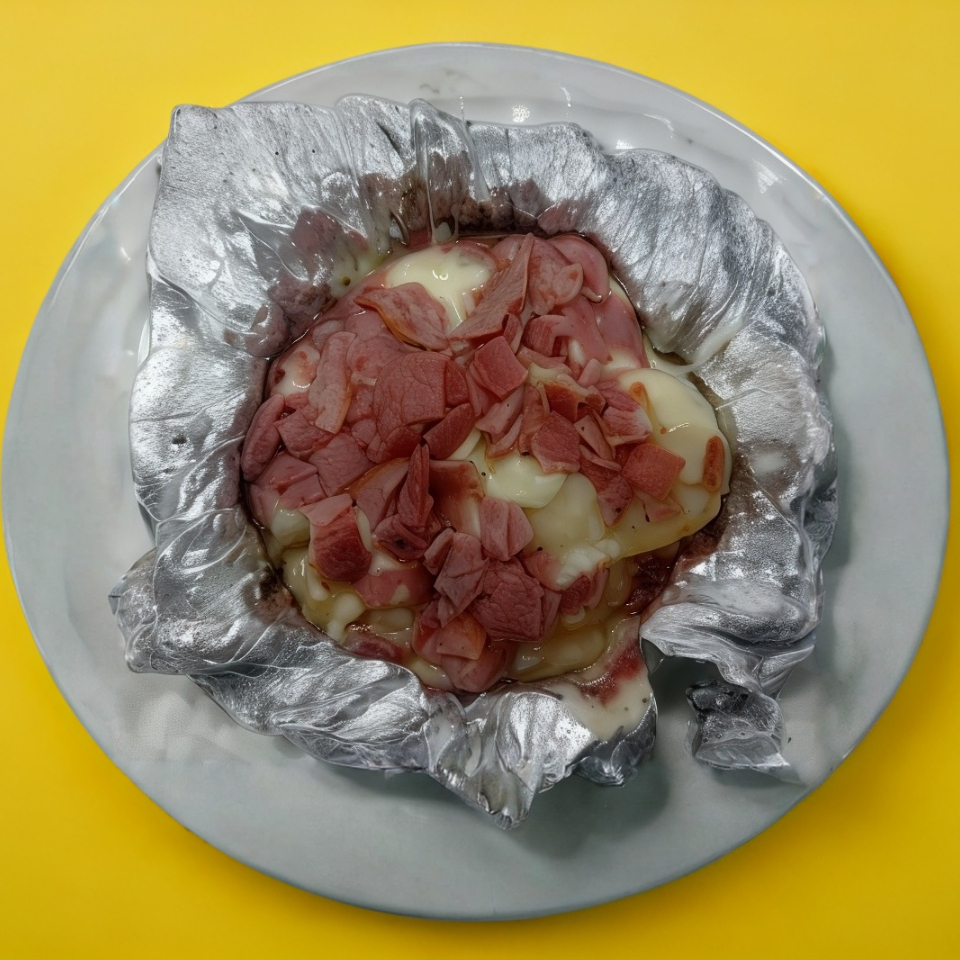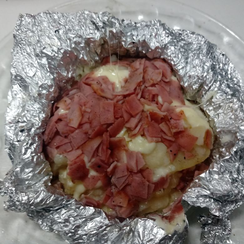 Con mantequilla, jamón, tocino, queso, chile y aderezos.