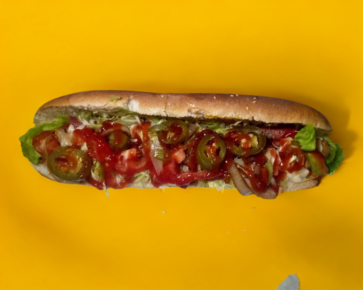Con mantequilla, salchicha asada, queso, chile y aderezos.