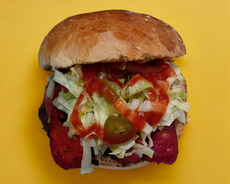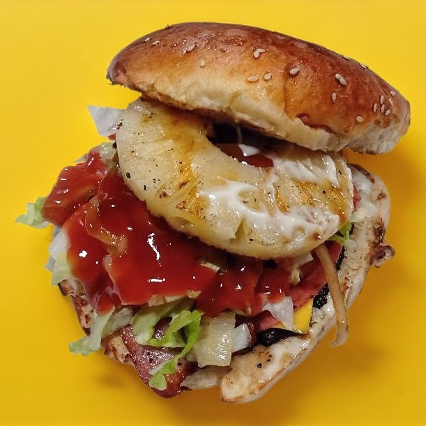 Hamburguesa con salchicha para asar, con queso, jamón y tocino.