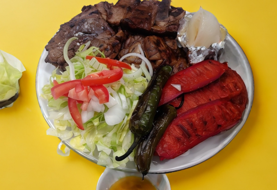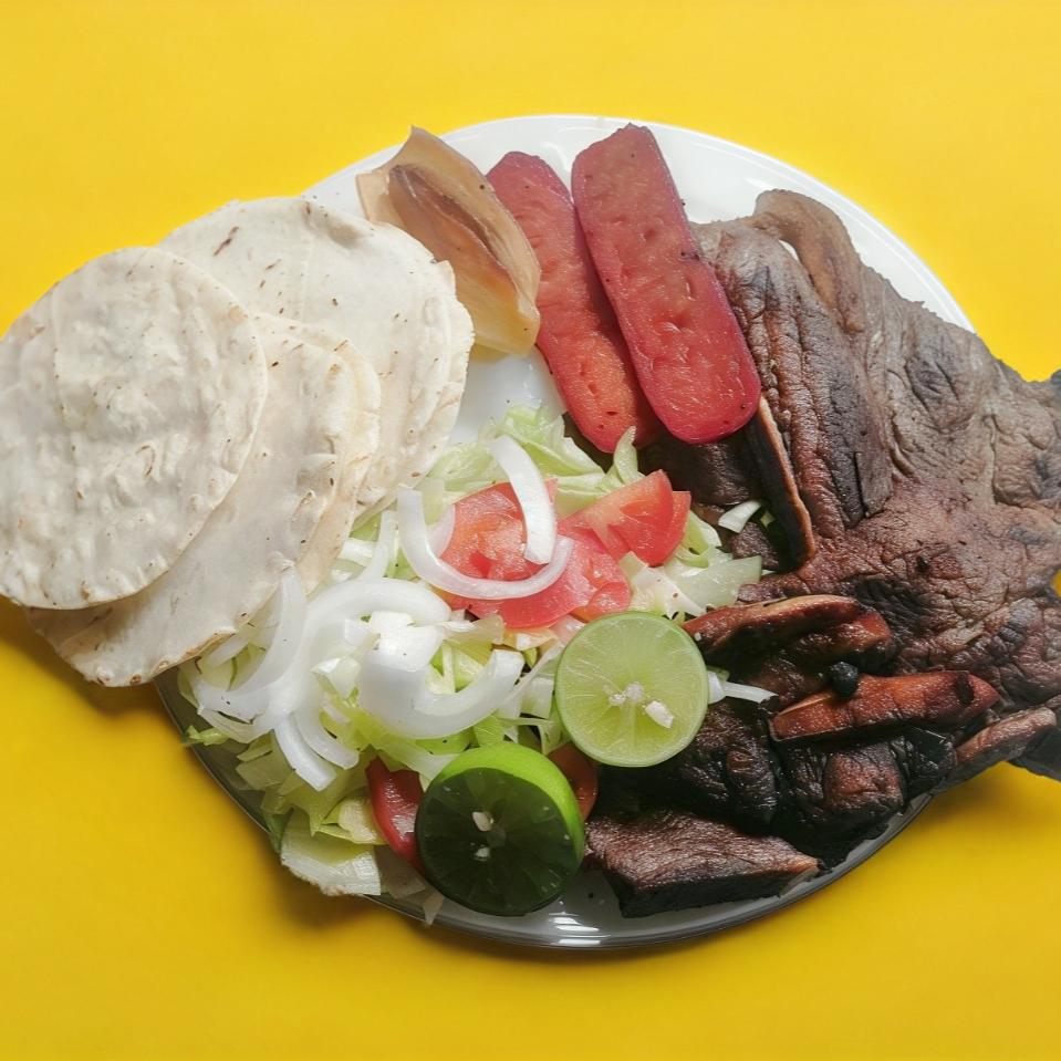 1/2 Kilo de carne asada, salchicha asada, cebolla, verdura, tortillas y salsa.