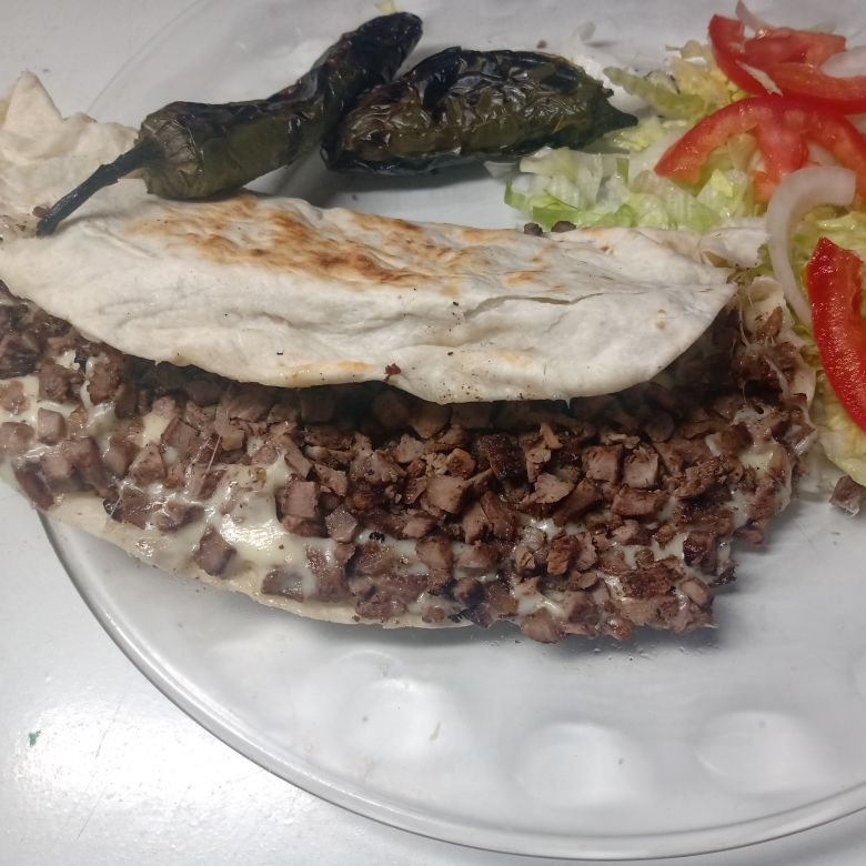 Tortilla de harina con queso, carne asada, verdura y salsa.