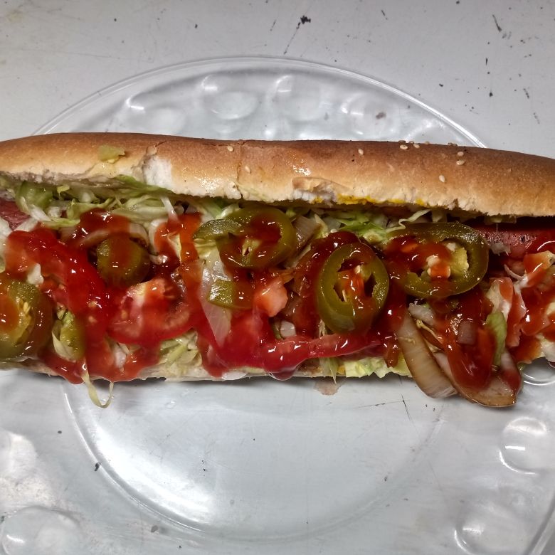 Con mantequilla, jamón, tocino, salchicha asada, carne asada, queso, chile y aderezos.