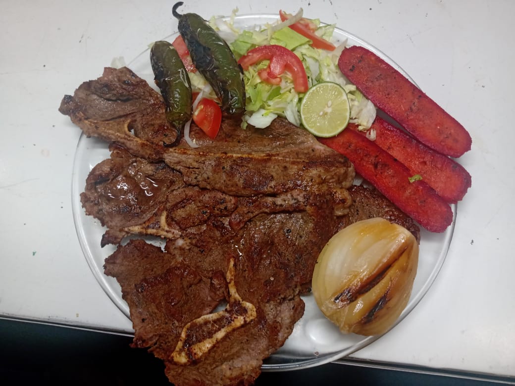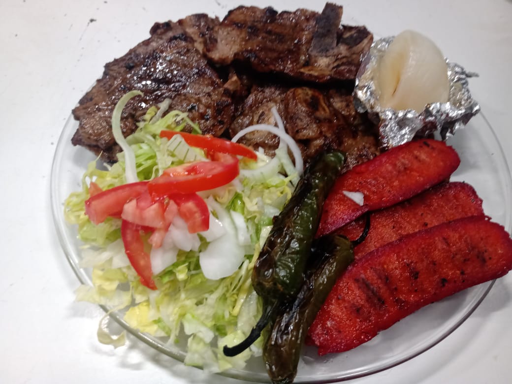 1/2 Kilo de carne asada, salchicha asada, cebolla, verdura, tortillas y salsa.