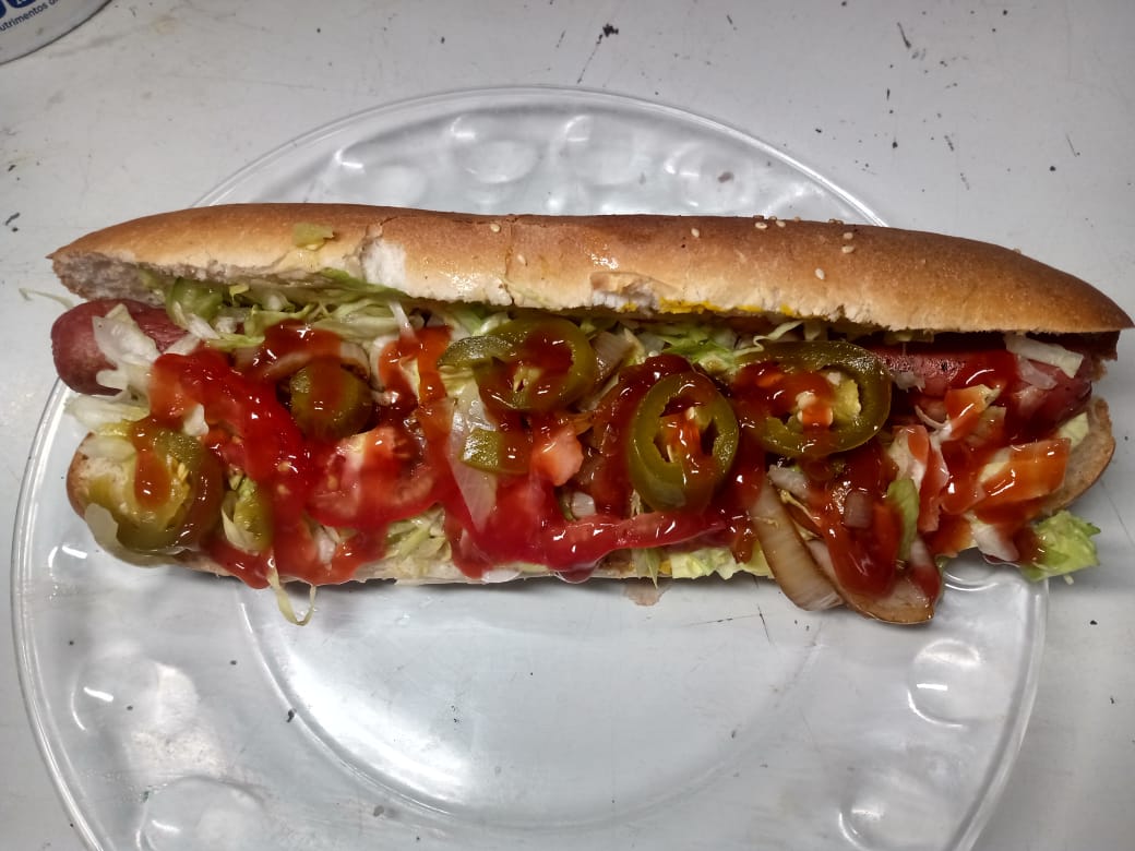 Salchicha con verduras y aderezos.
