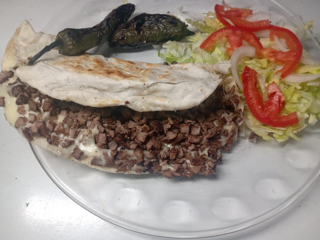 Tortilla de harina con queso, carne asada, verdura y salsa.
