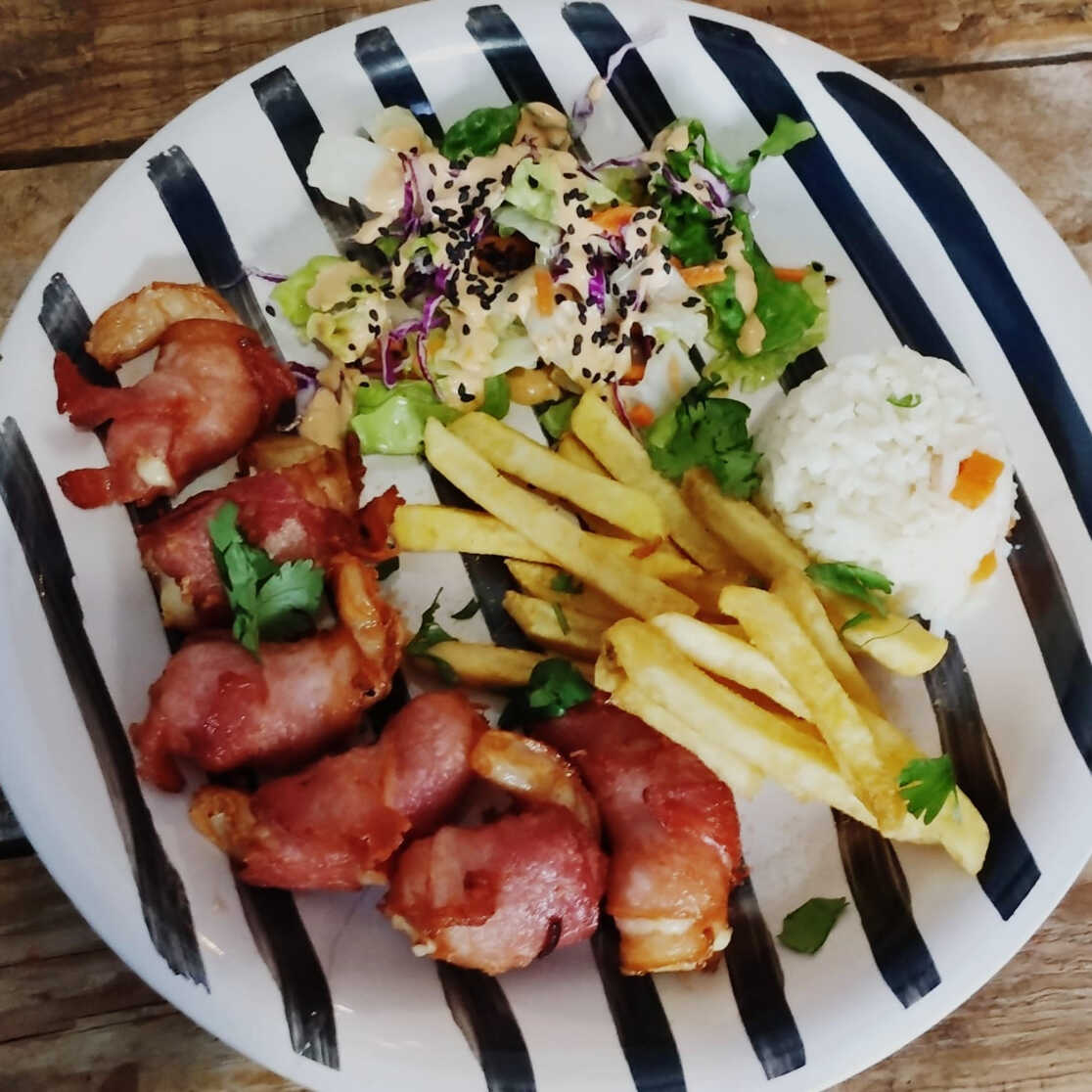 180 g de camarones jumbo envueltos en tocino ahumado (60 g) y queso mozzarella, horneados hasta gratinar. Servidos con ensalada (lechuga, tomate, pepino), arroz blanco y aderezos.