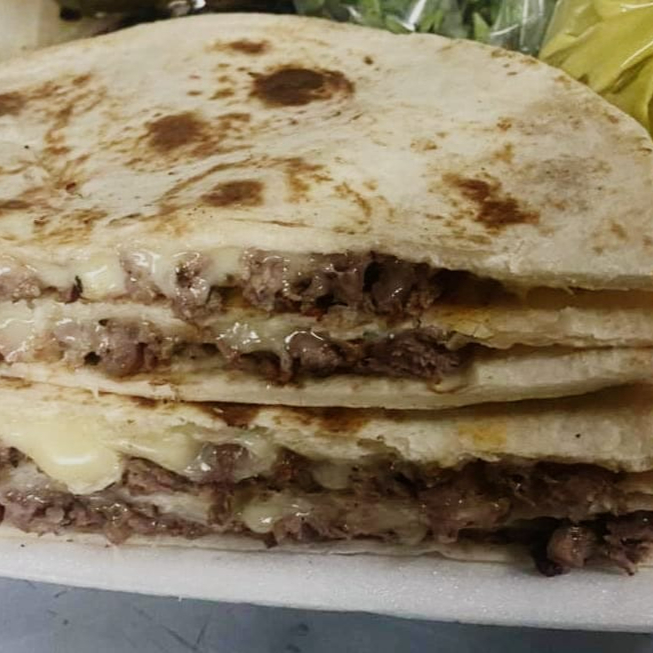 Tortilla de harina (60 g) con mezcla de 45 g de sirloin y 45 g de arrachera, queso fundido, cebolla blanca y salsa de chile pasilla.