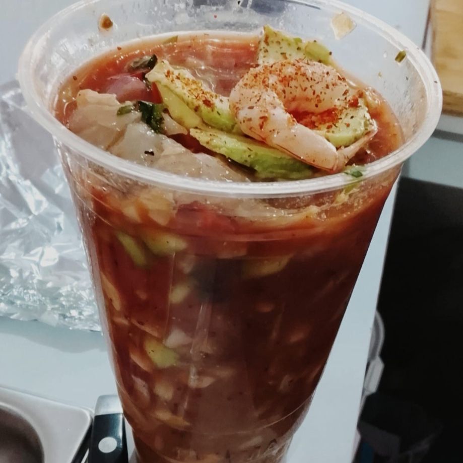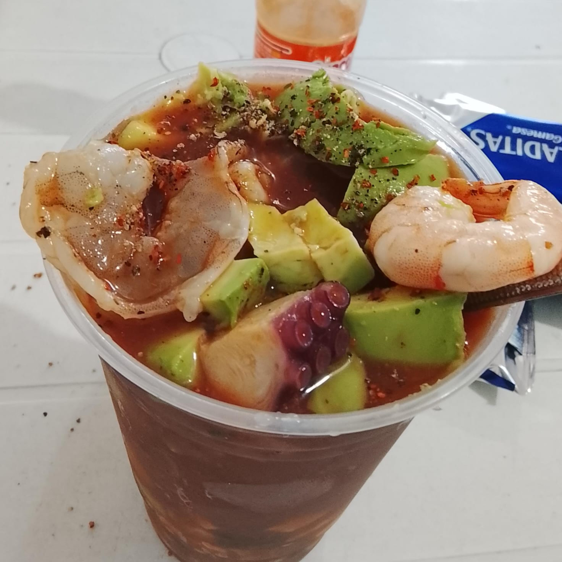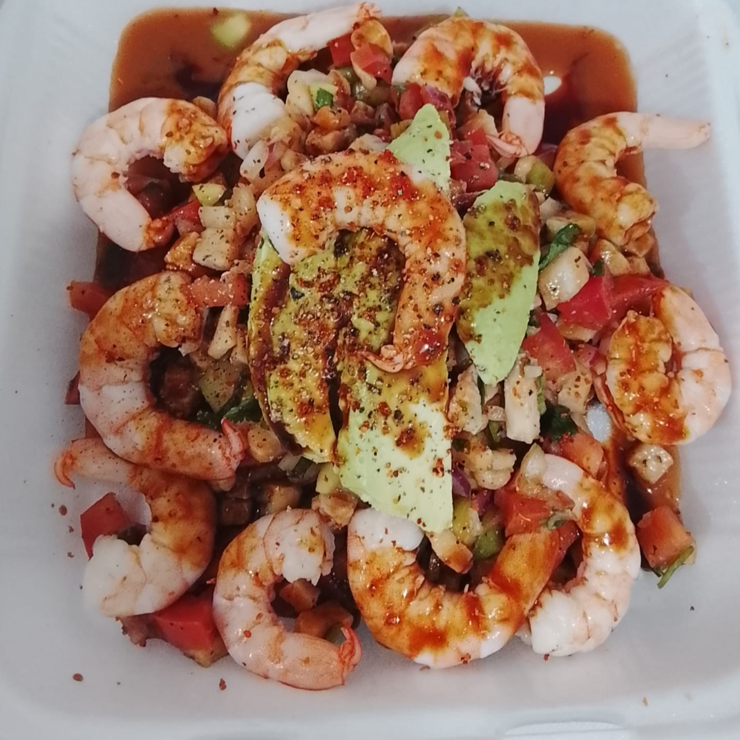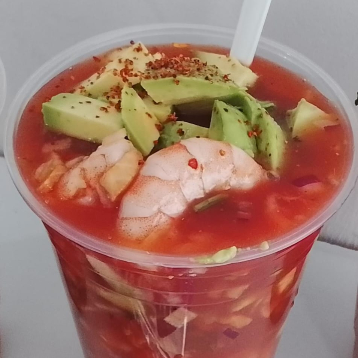 Porción de 500 g de camarón cocido, jitomate, cebolla, cilantro, jugo de limón, salsa especial de la casa (con clamato, chile serrano, jugo de camarón y especias), y aguacate.