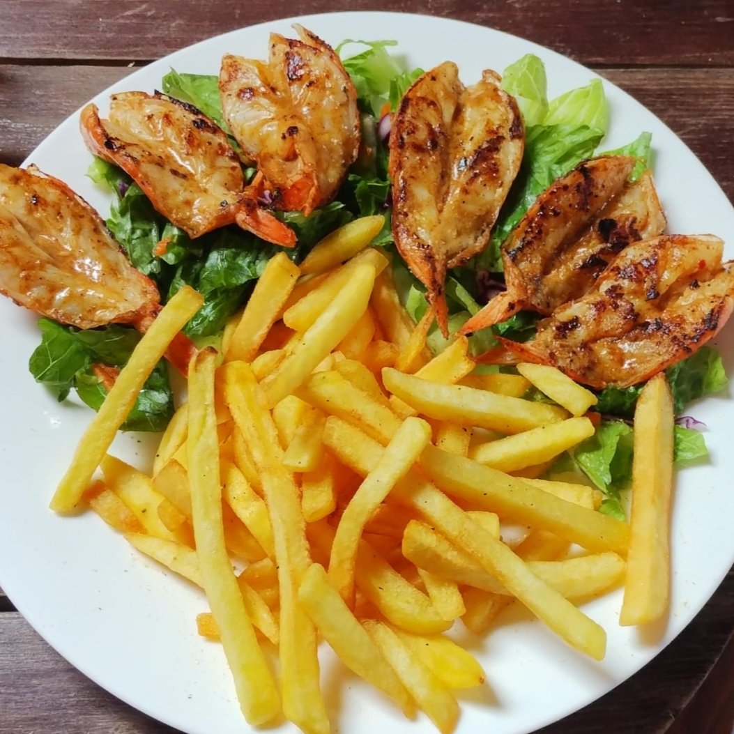 200 g de camarón jumbo corte mariposa, marinados en salsa Zaranda (mezcla de chile guajillo, ajo, limón, aceite de oliva y especias), asados a la plancha. Acompañados de ensalada (repollo, zanahoria, pepino), papas fritas, salsas negras y aderezos.