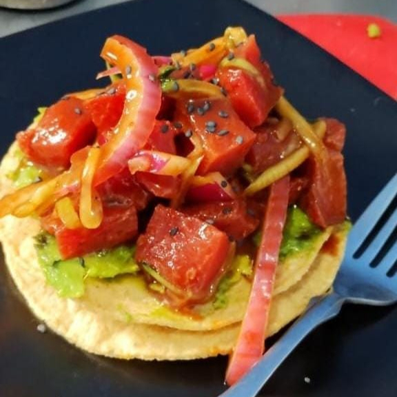 Tostada (25 g) con 100 g de atún fresco en cubos, marinados en salsas negras (soja, ajonjolí, limón). Se acompaña con pepino, cebolla morada, aguacate y fruta opcional (mango, piña o fresa).