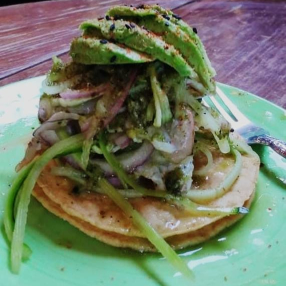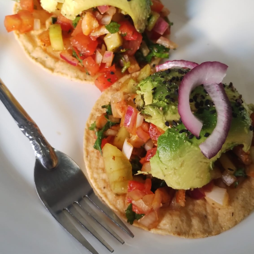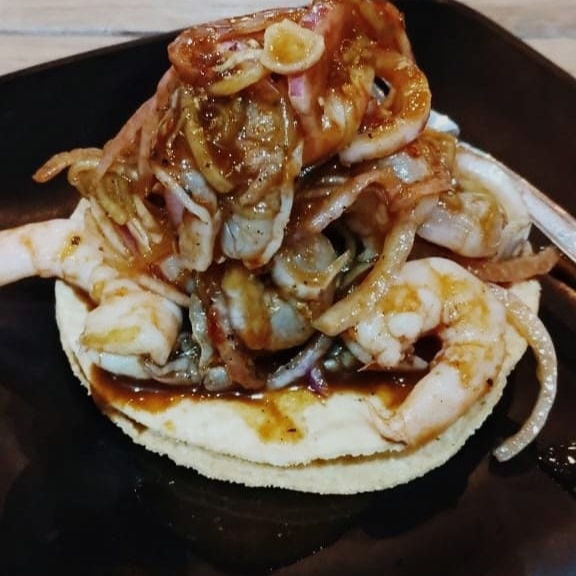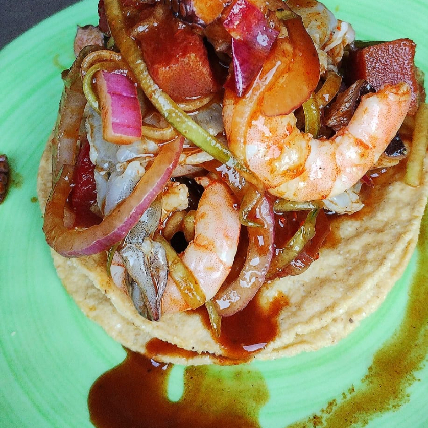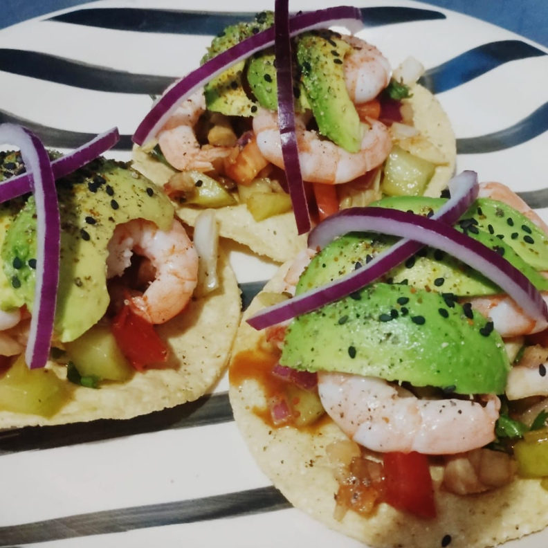 Tostada (25 g) con camarón cocido (80 g) y curtido (80 g), bañadas en salsas negras, acompañadas de pepino, cebolla morada, cilantro y aguacate.