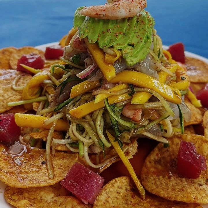 Tostada (25 g) con camarón curtido (60 g), camarón cocido (60 g), sashimi de atún (40 g), salsas negras, pepino, cebolla morada, aguacate y piña fresca. Sazonado con limón y sal.