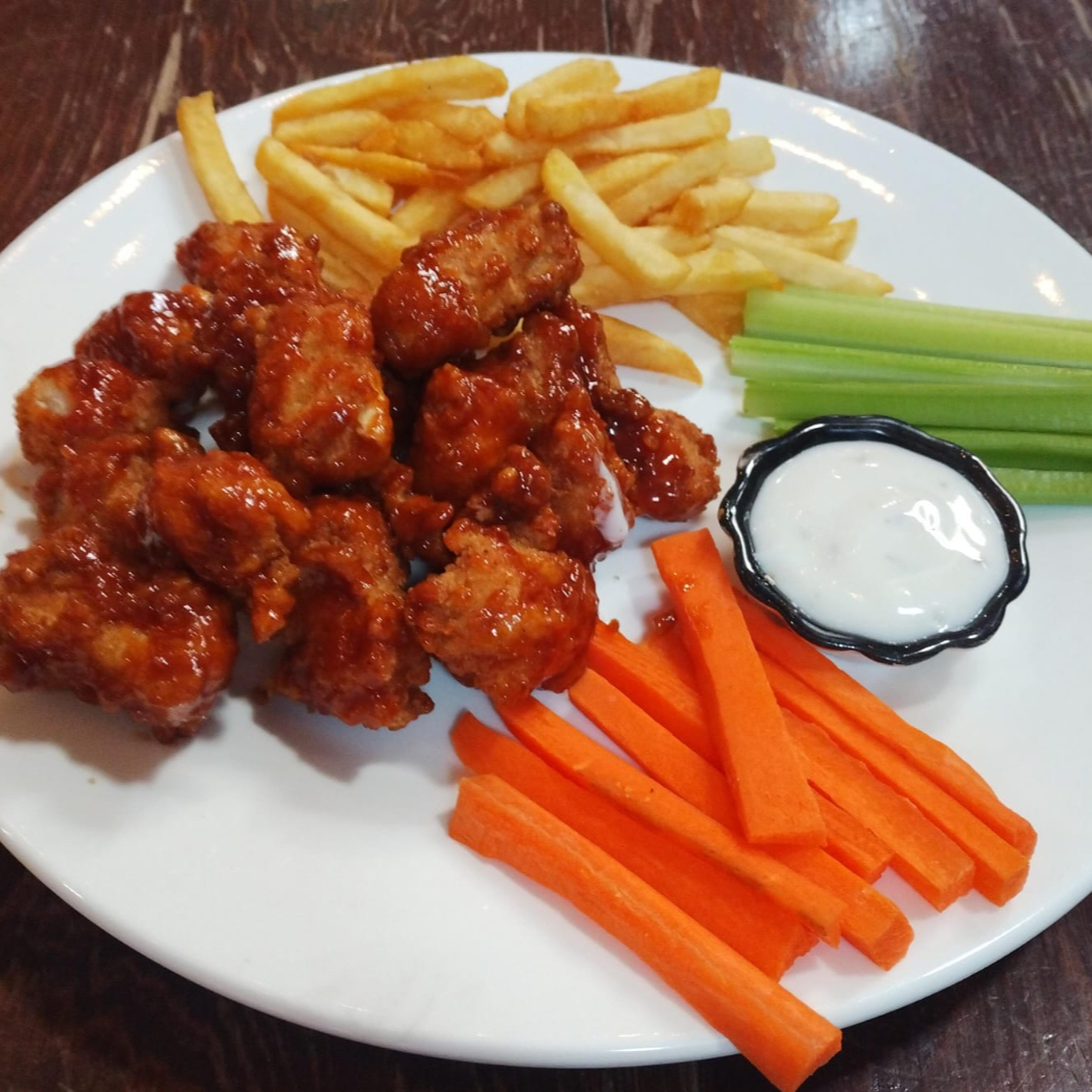 Porción de 180 g de pollo, acompañada de 150 g de papas fritas, 40 g de bastones de zanahoria fresca y apio. Se sirve con aderezo ranch (a base de crema, ajo, cebollino y perejil) y salsa a elección (BBQ, búfalo, miel-mostaza).