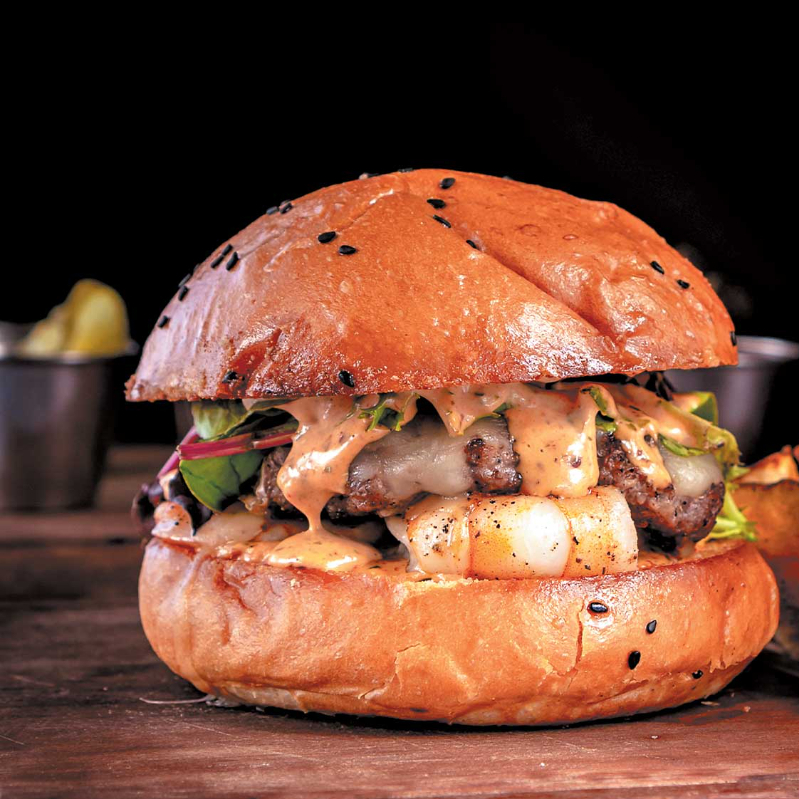 Una fusión de sabores con 120 g de sirloin de carne y 80 g de camarones empanizados, acompañados de 2 tiras de tocino (30 g), queso blanco fundido, aderezo americano, lechuga romana, tomate y cebolla morada. Servido en pan brioche.