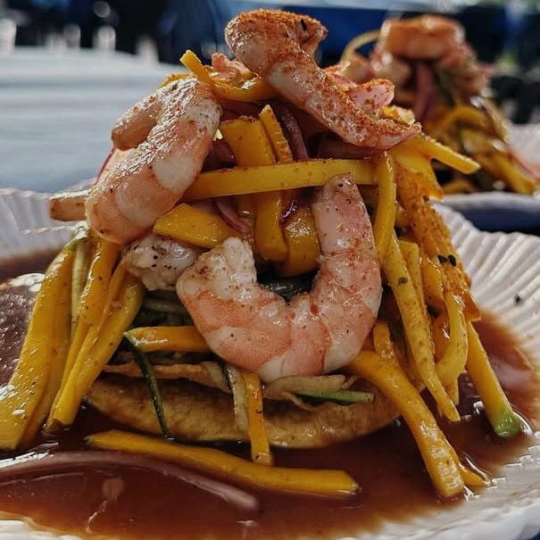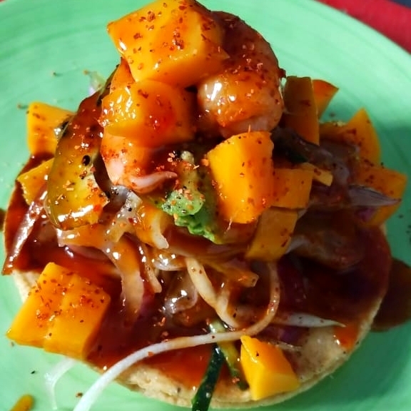 Tostada (25 g) con camarón curtido (80 g) y cocido (80 g), bañados en salsa mango habanero (30 g). Se acompaña con pepino, cebolla morada, cilantro y aguacate. Toques de sal y limón.